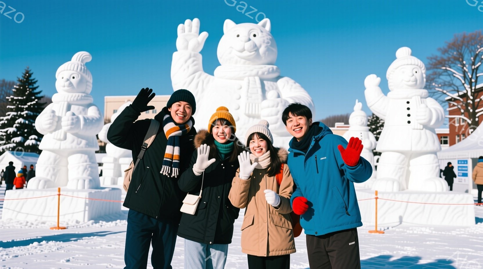 雪像が立ち並ぶ雪原で、若い男女4人が笑顔でポーズをとっています。男性は紺色のジャケットとベージュのパンツ、女性は黒のコート、ベージュのコート、そして黒のコートに身を包み、それぞれ異なるヘアスタイルをしています。背景には雪をまとった建物と山々が見え、晴天の下、雪と氷の芸術祭の華やかな雰囲気が漂っています。