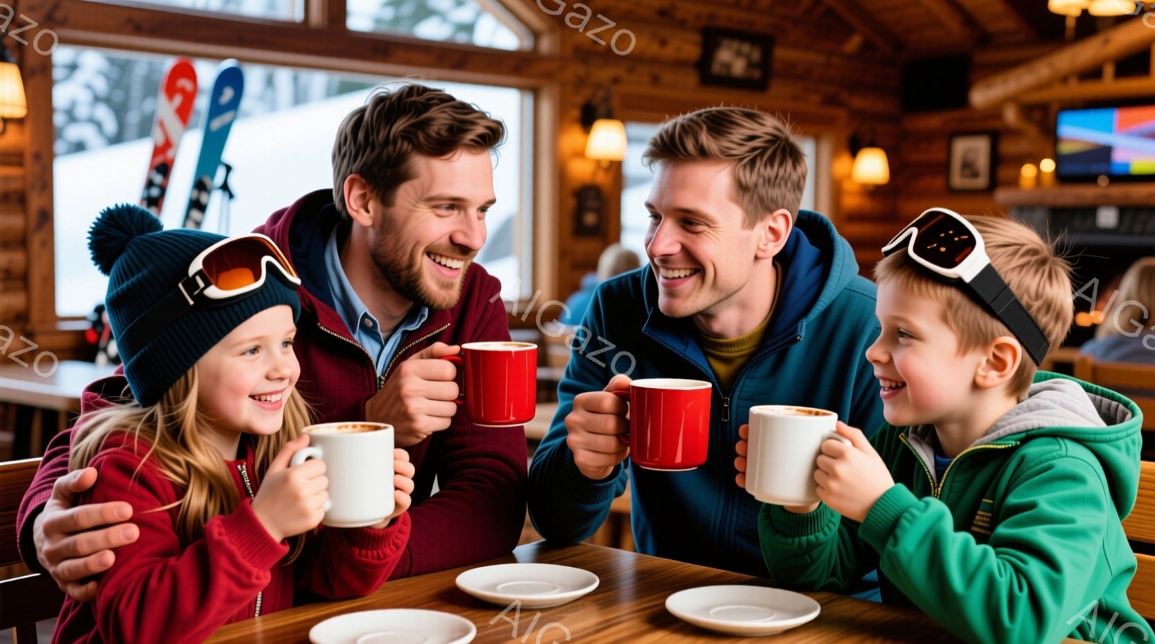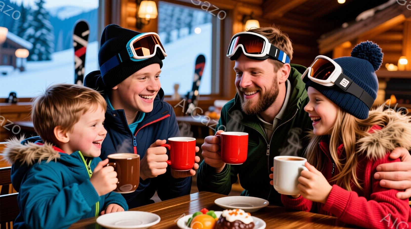 暖炉のある木のテーブルを囲み、家族四人が笑顔でマグカップを手にしている。母親は黒いニット帽を被り、娘は赤いニット帽、息子はクリーム色の帽子を被り、父親はサングラスをかけている。背景には雪山が広がり、室内は温かく居心地の良い雰囲気で、夕食の準備をしている様子が伺える。