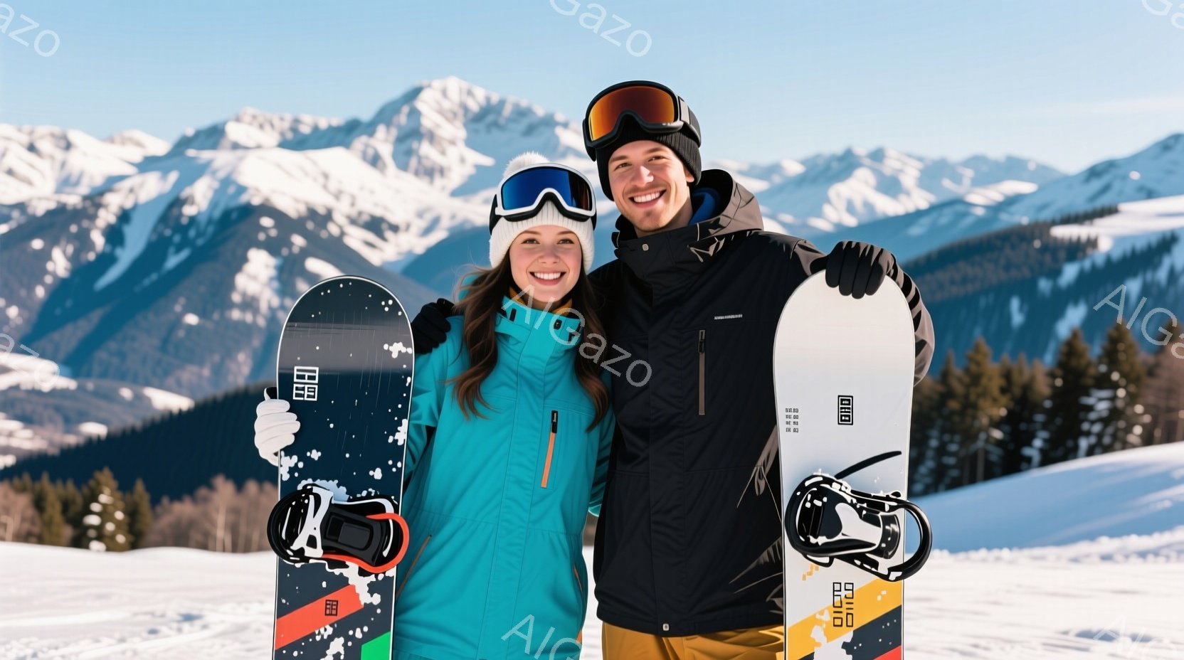 白い背景に、スノーボードを持った若い男女が寄り添って立っています。女性は長い茶髪で、白いジャケットと黒いズボンを着用し、明るい笑顔を見せています。男性は黒いジャケットに茶色のズボンを着用し、ゴーグルをかけて楽しそうに微笑んでいます。