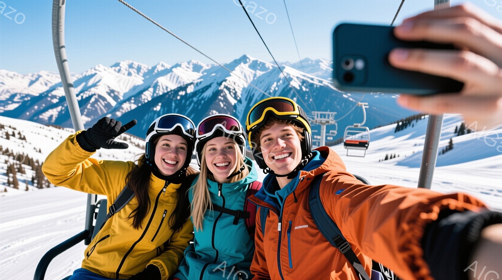 雪山を背景に、リフトに乗った4人の若者が写っている。彼らは全員スキーゴーグルと冬用のジャケットを着用しており、それぞれ黄色、青、赤などの鮮やかな色の服を着ている。笑顔でカメラに向かってポーズをとっており、リフトの椅子と雪景色が楽しげな雰囲気を醸し出している。