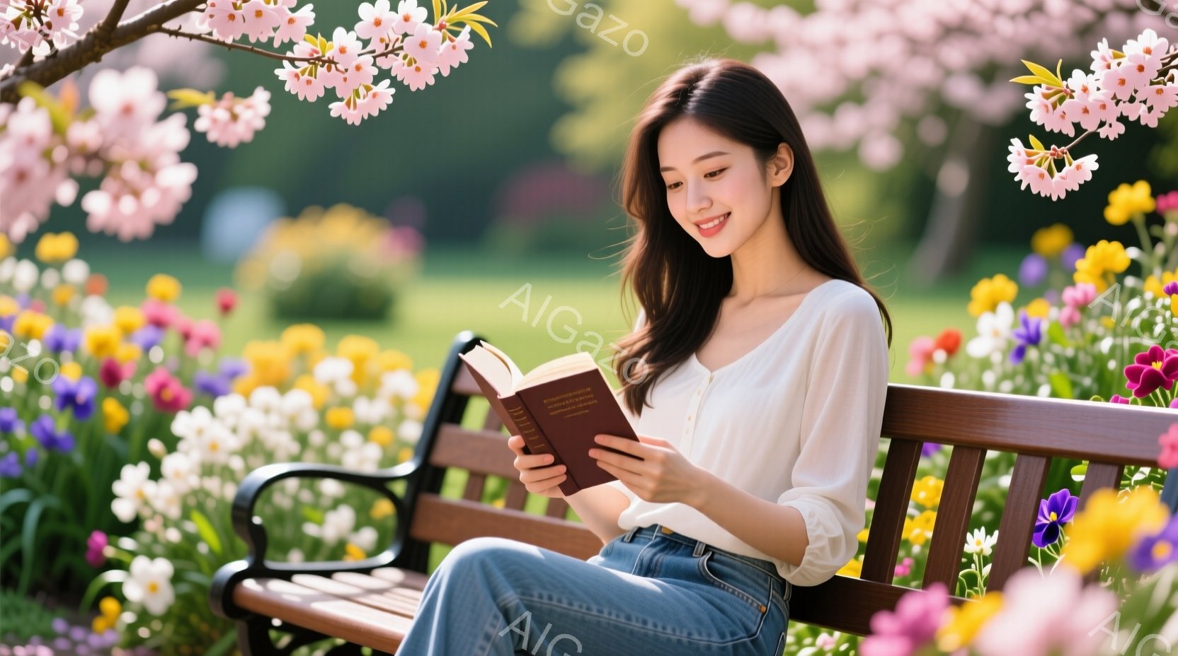 長い黒髪をサイドに流した女性が、公園のベンチに座って本を読んでいる。白い長袖シャツとジーンズ姿で、リラックスした表情で本に集中している。背景には、ピンク色の花々が咲き乱れ、緑豊かな自然が広がり、穏やかで春らしい雰囲気が漂っている。