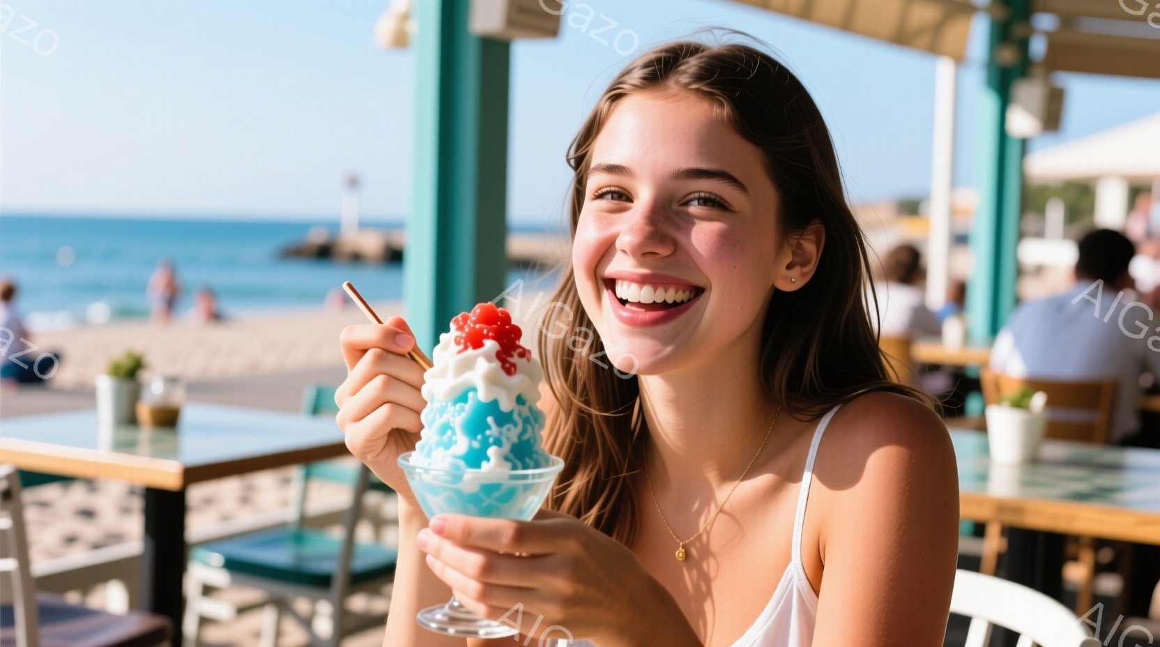 若い女性がカラフルなかき氷を手に笑顔で写っています。彼女は肩出しのチェック柄のトップスを着ており、髪は後ろで結んでいます。背景には青い海と砂浜、そしてパラソルとテーブルのある屋外のカフェが見え、晴れた日のリラックスした雰囲気が漂っています。