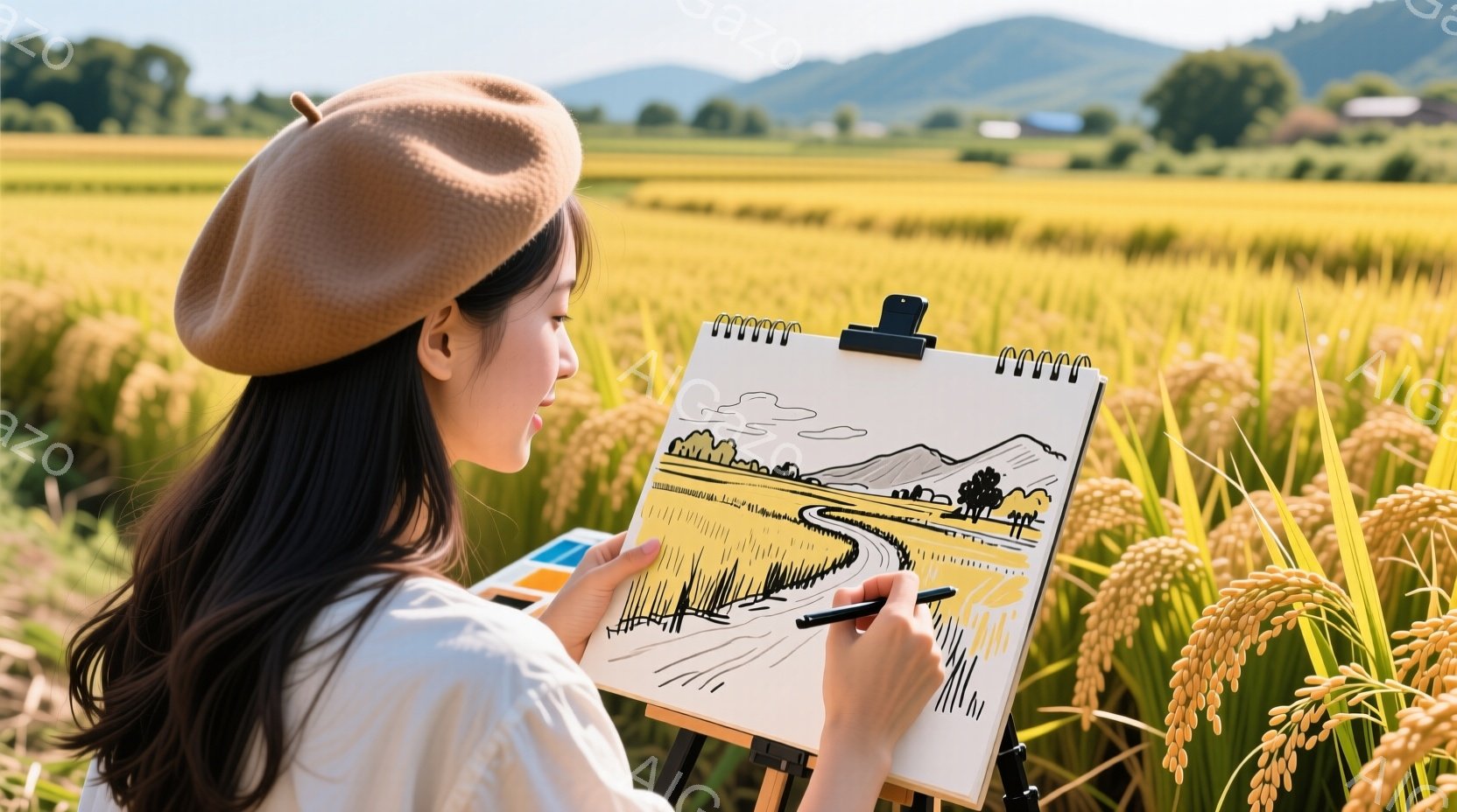 麦畑で女性がイーゼルに向かい、風景画を描いている。彼女はベージュ色のベレー帽とオフホワイトのシャツを着ており、長い黒髪が肩にかかっている。背景には緑豊かな山々と広がる麦畑が広がり、穏やかで平和な雰囲気が漂っている。