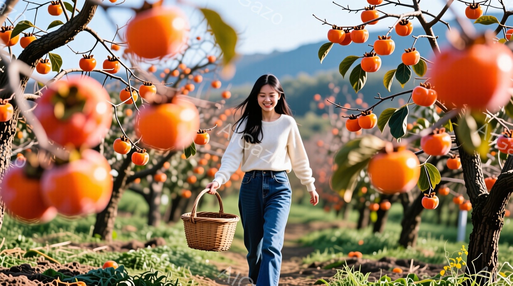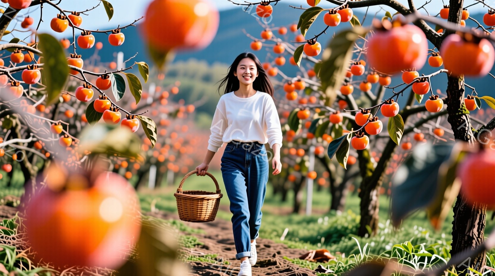 彼女は白いTシャツとジーンズを着て、籐の籠を持ってオレンジ色の柿の木立の中を歩いている。笑顔で、リラックスした様子で歩いている。背景には、柿がたくさん実った木々と、霞んだ遠くの山々が見え、全体的に暖かく、穏やかな雰囲気である。