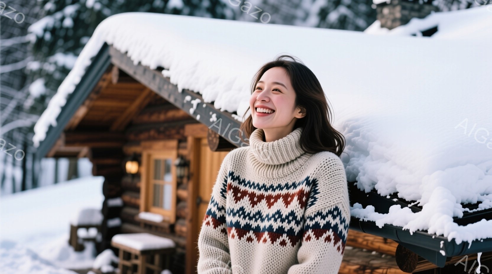 長い黒髪の女性が、白く雪景色を背景に微笑んでいます。彼女はクリーム色のノルディック柄のセーターを着ており、リラックスした姿勢で建物の壁に寄りかかっています。背景には、雪で覆われた丸太小屋があり、冬の穏やかで温かい雰囲気を醸し出しています。