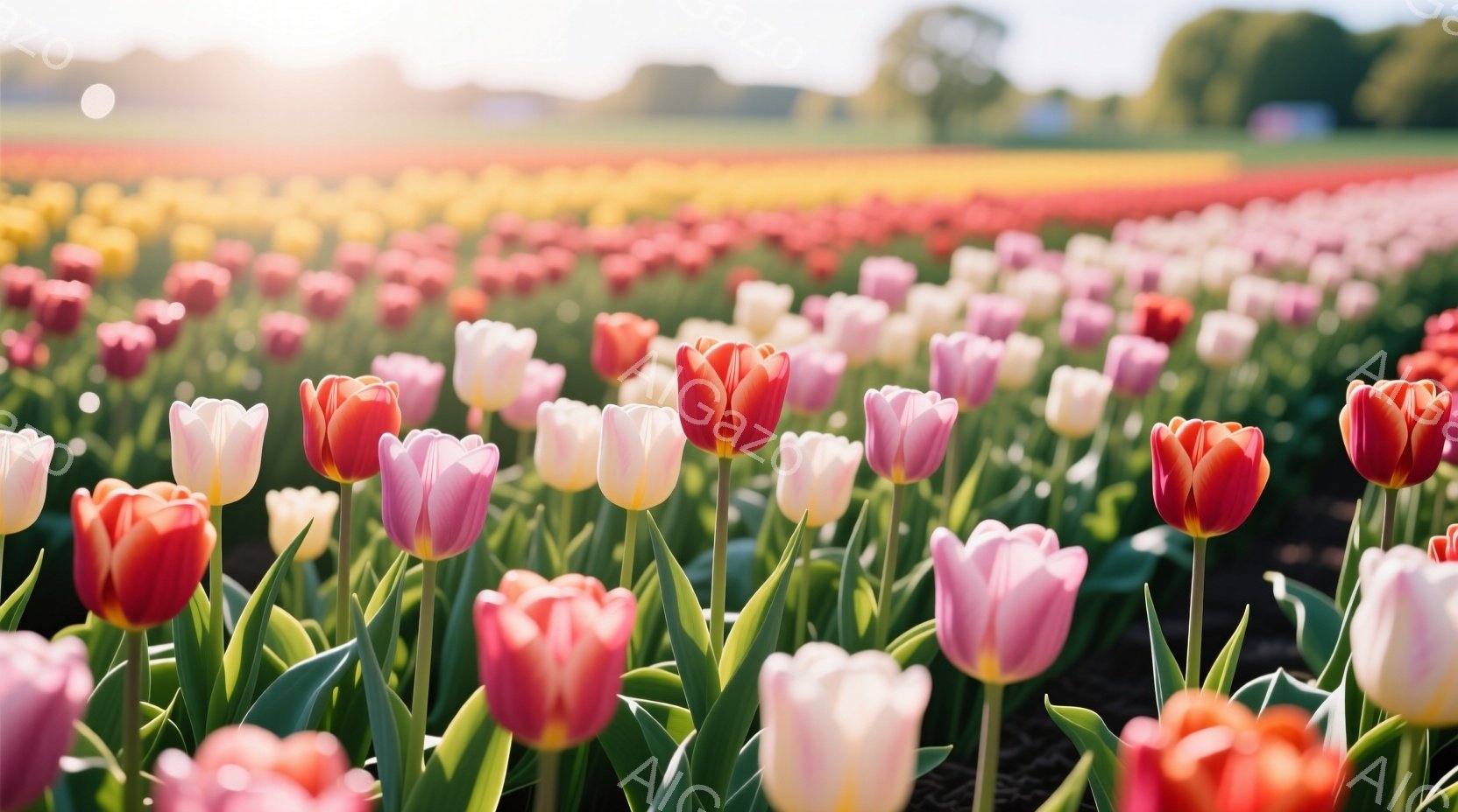 色とりどりのチューリップが咲き誇る畑が広がっている。手前にピンクと白のチューリップが咲き、奥にはオレンジや黄色などの様々な色のチューリップがぼやけて見える。太陽の光が差し込み、明るく華やかな春の雰囲気を醸し出している。