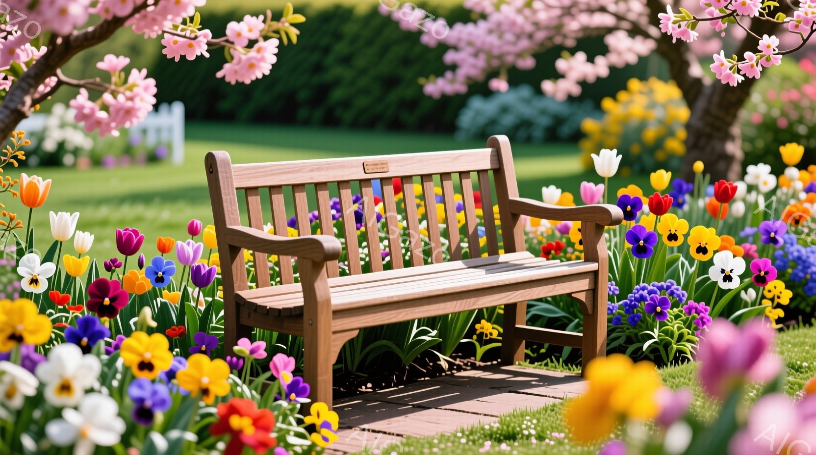 色とりどりのチューリップや花々が咲き乱れる庭園の中に木製のベンチが置かれています。背景には緑豊かな芝生と桜の木が見え、春の穏やかな日差しが降り注いでいます。ベンチの周りには様々な種類の花が咲き、まるで絵画のような美しい景色が広がっています。