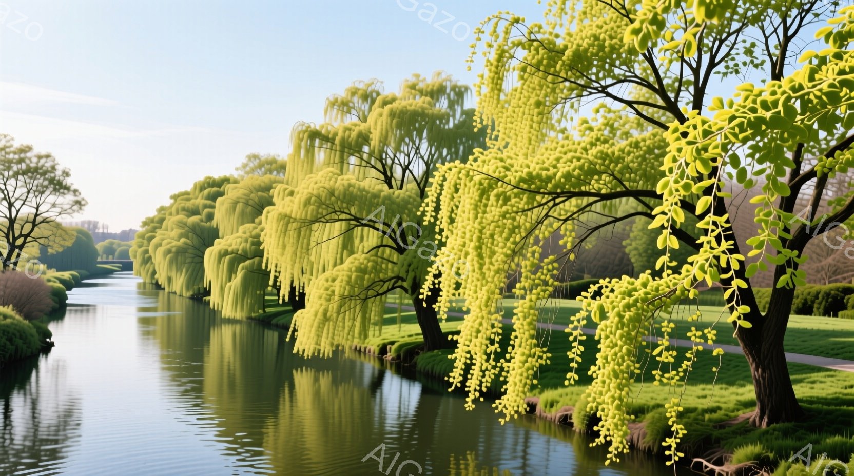 柳並木が両岸に続く水路が中央を走り、穏やかな水面が光を反射している。遠景には建物が見え、空は晴れ渡っており、春の暖かく穏やかな雰囲気が漂っている。水路の縁には緑豊かな草が生い茂り、全体的に静かで平和な情景が広がっている。