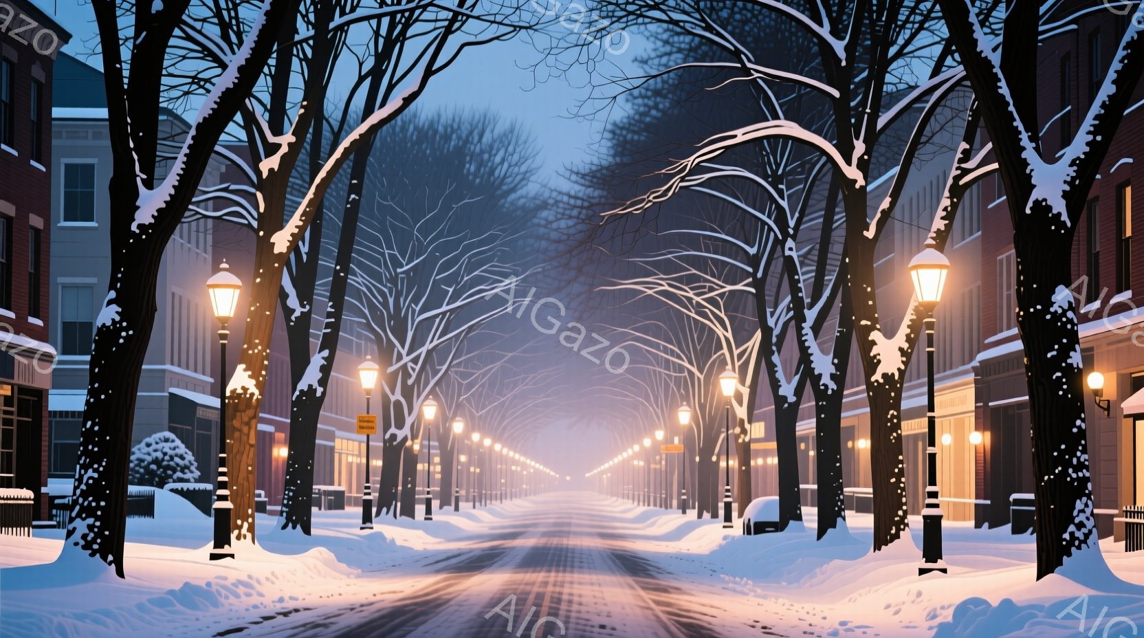 雪が降り積もった並木道が続く、冬の夕暮れ時の街並みである。街路灯が雪に照らされ、暖かく光を放っている。建物の窓から漏れる光と雪景色が、静かで幻想的な雰囲気を醸し出している。
