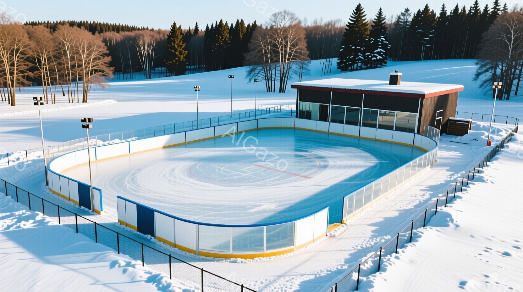 雪深い森の中に丸太小屋が建っている。屋根には雪が積もり、煙突からは湯気が立ち上っていることから、内部で暖炉が使われていることがわかる。背景にはうっそうとした針葉樹林が立ち並び、静寂で穏やかな冬の雰囲気を醸し出している。