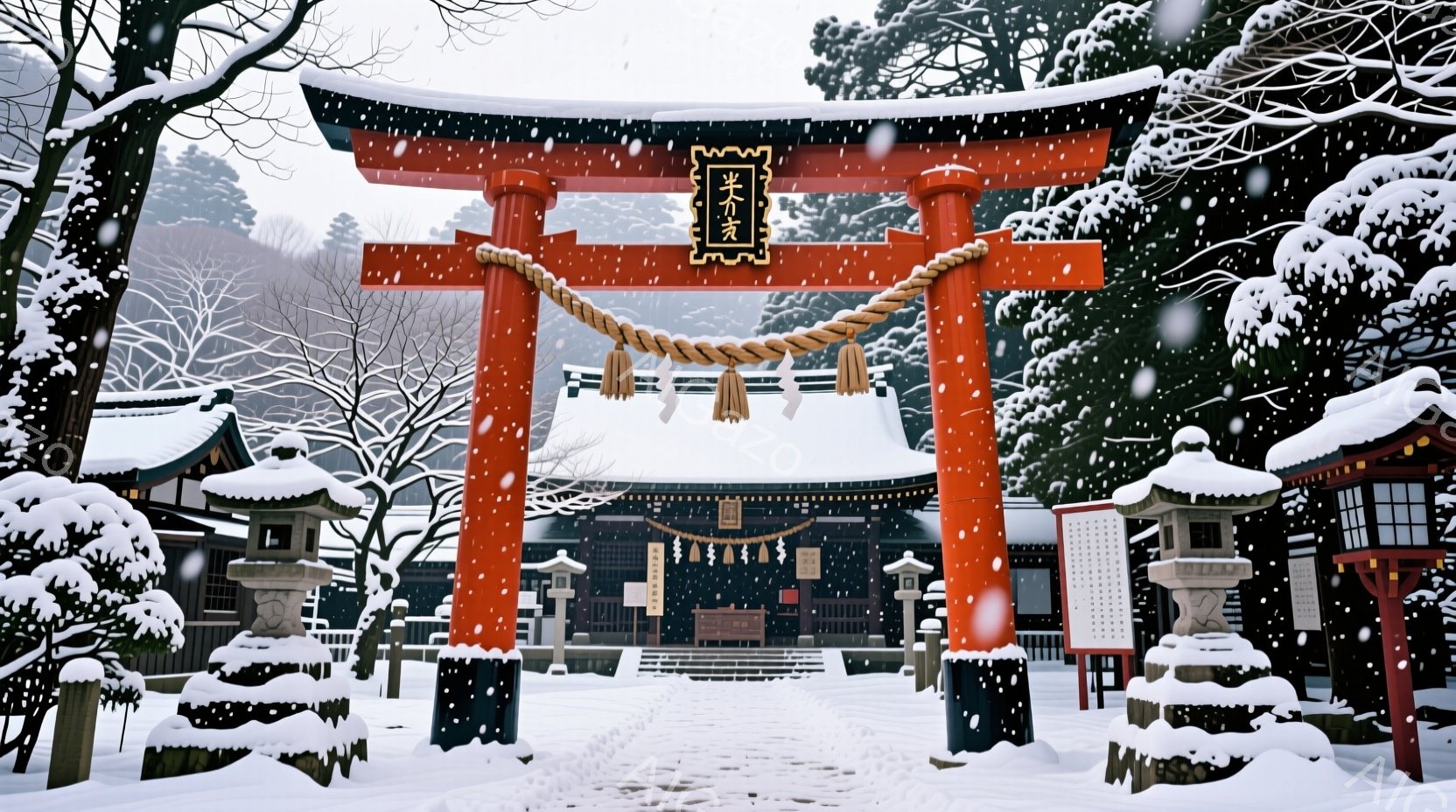 雪が降り積もる中、鮮やかな朱色の鳥居が印象的な風景です。背景には、伝統的な屋根を持つ建物が並び、雪景色と調和しています。全体的に静寂で厳かな雰囲気が漂い、冬の日本の神社の美しさが際立っています。