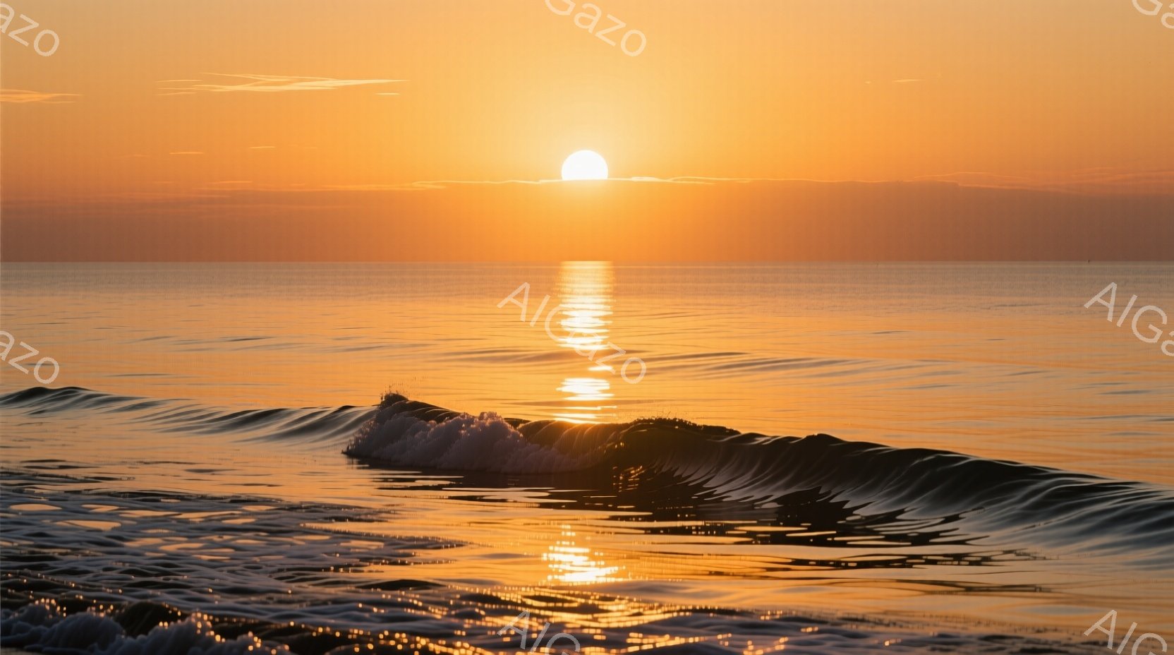 穏やかな波が太陽の光を反射し、黄金色の輝きを海面に広げている。地平線には明るい太陽が昇り、空全体を暖かなオレンジ色で染め上げている。波の微妙な起伏と光の反射が、静寂で穏やかな雰囲気を醸し出している。