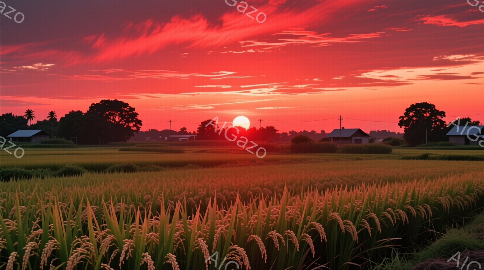 広大な稲田が夕焼けに染まり、黄金色に輝いている。遠くには屋根付きの建物と木々が見え、空は燃えるような赤色で、沈みゆく太陽がシルエットで浮かび上がっている。全体的に、穏やかで、日本の田舎の静寂な夕暮れを感じさせる雰囲気である。