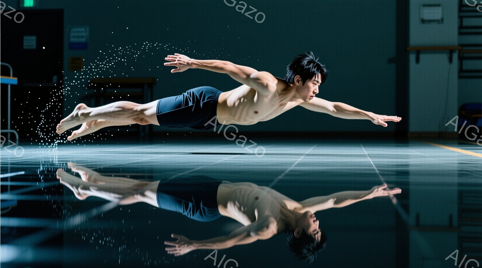 この無料AI生成画像「競技用水泳場で、筋肉質な男性が水中でダイナミックな姿勢で泳いでいる。彼は黒いスイムキャップとゴーグルを着用し、ネイビーと黒のスイムパンツを身につけている。水面には水しぶきが飛び散り、水面の反射が彼のシルエットを強調し、力強くスピード感のある雰囲気を醸し出している。」は、2025年10月26日に作成されました。 サイズは 1664×928px の高解像度で、商用利用も可能なフリー素材として提供しています。