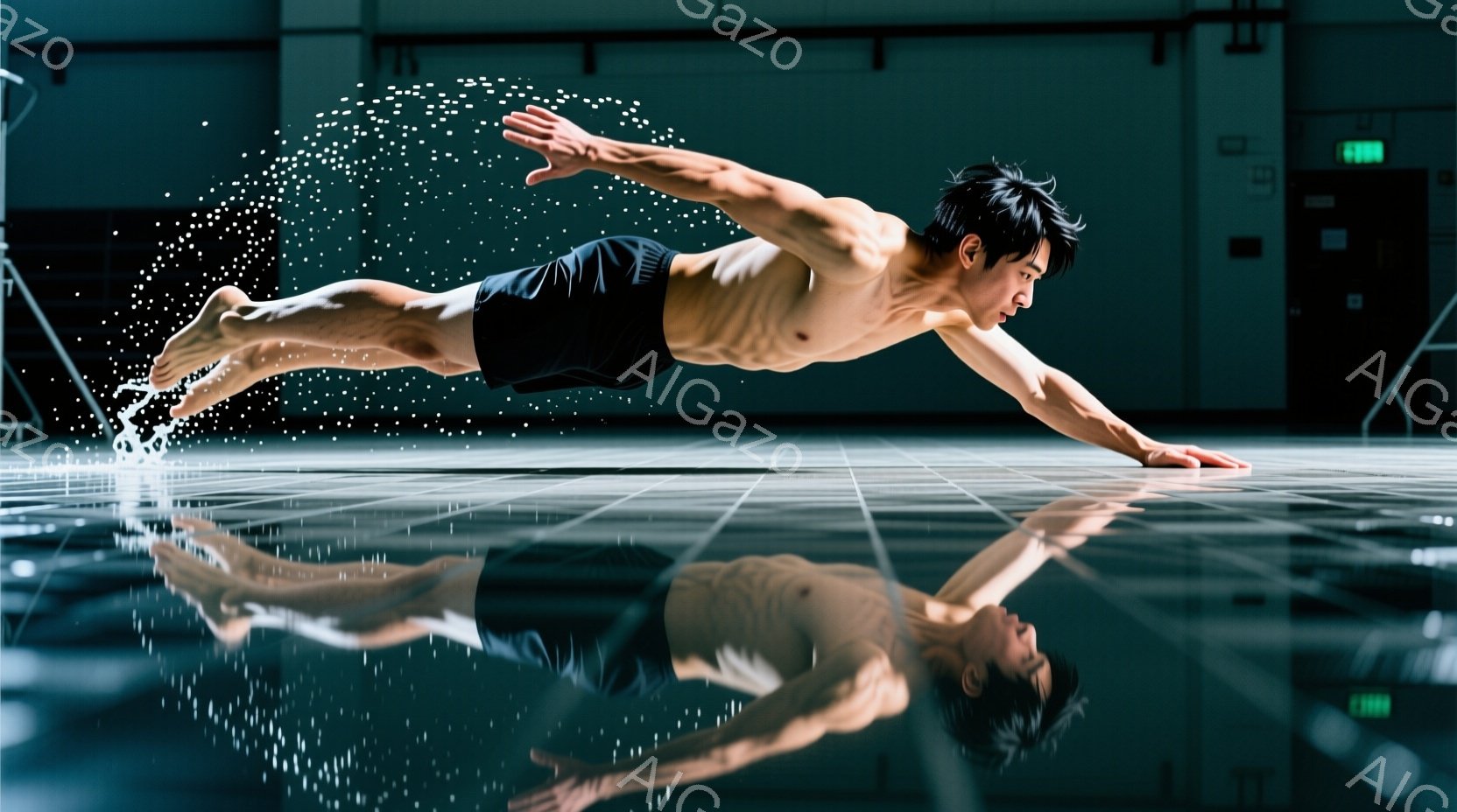 競技用水泳場で、筋肉質な男性が水中でダイナミックな姿勢で泳いでいる。彼は黒いスイムキャップとゴーグルを着用し、ネイビーと黒のスイムパンツを身につけている。水面には水しぶきが飛び散り、水面の反射が彼のシルエットを強調し、力強くスピード感のある雰囲気を醸し出している。