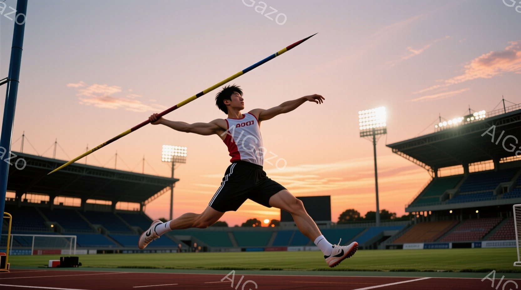 競技場内で、陸上競技の選手が槍投げの最中に空中で躍動している様子が捉えられています。彼は黒と赤の陸上着を身に着け、短髪で、集中した表情で槍を力強く投げようとしています。背景には、夕焼け空の下、観客席が広がり、競技場の照明が点灯し始めており、活気に満ちた競技の瞬間を切り取っています。