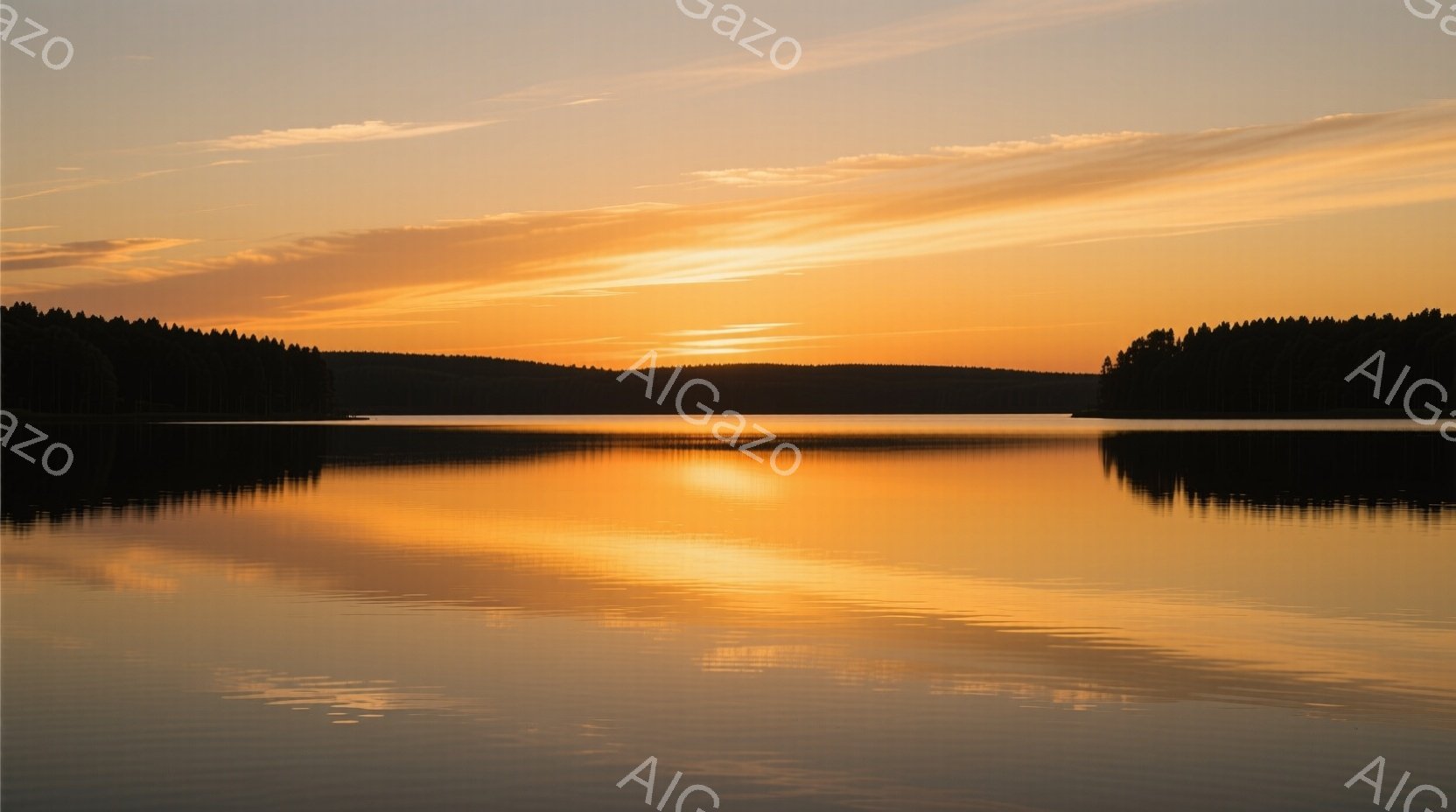静かな湖面が夕焼けのオレンジ色を映し出し、水平線付近で太陽が沈みかけている様子が捉えられています。遠くには緑の森林が広がり、穏やかな夕暮れ時の静寂と自然の美しさを感じさせる風景です。水面は鏡のように滑らかで、空と森林の鮮やかな色彩が完璧に反射されています。