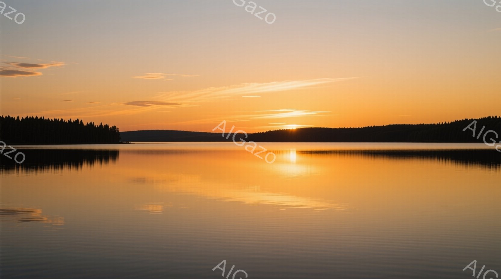 広大な湖面が夕焼けを映し出し、オレンジと黄色のグラデーションが水面全体に広がっている。遠くには暗い緑色の森林が連なり、静かで穏やかな雰囲気を醸し出している。空には薄い雲が広がり、夕日の光を柔らかく拡散させている。