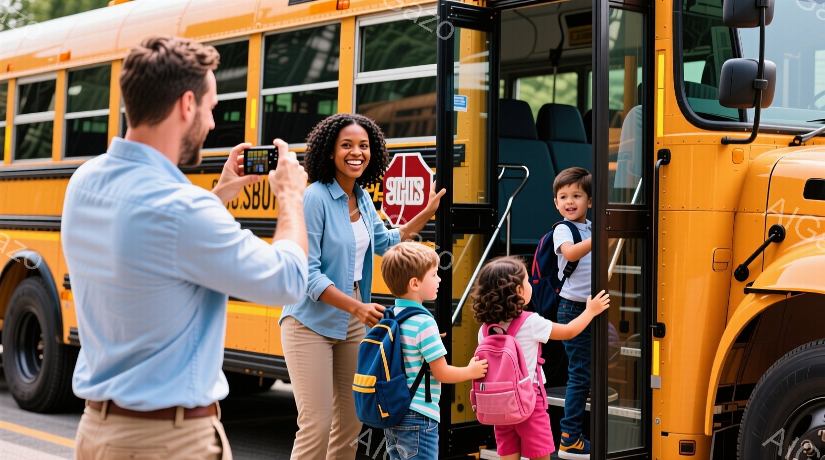 家族四人が並んで立っており、それぞれ青色のバックパックを背負っています。母親と父親は白いTシャツとベージュ色のズボンを着用し、子供たちはそれぞれ似たような服装で、明るい笑顔を浮かべています。背景には緑豊かな木々と穏やかな天候が広がっており、家族の楽しい外出の雰囲気が伝わってきます。
