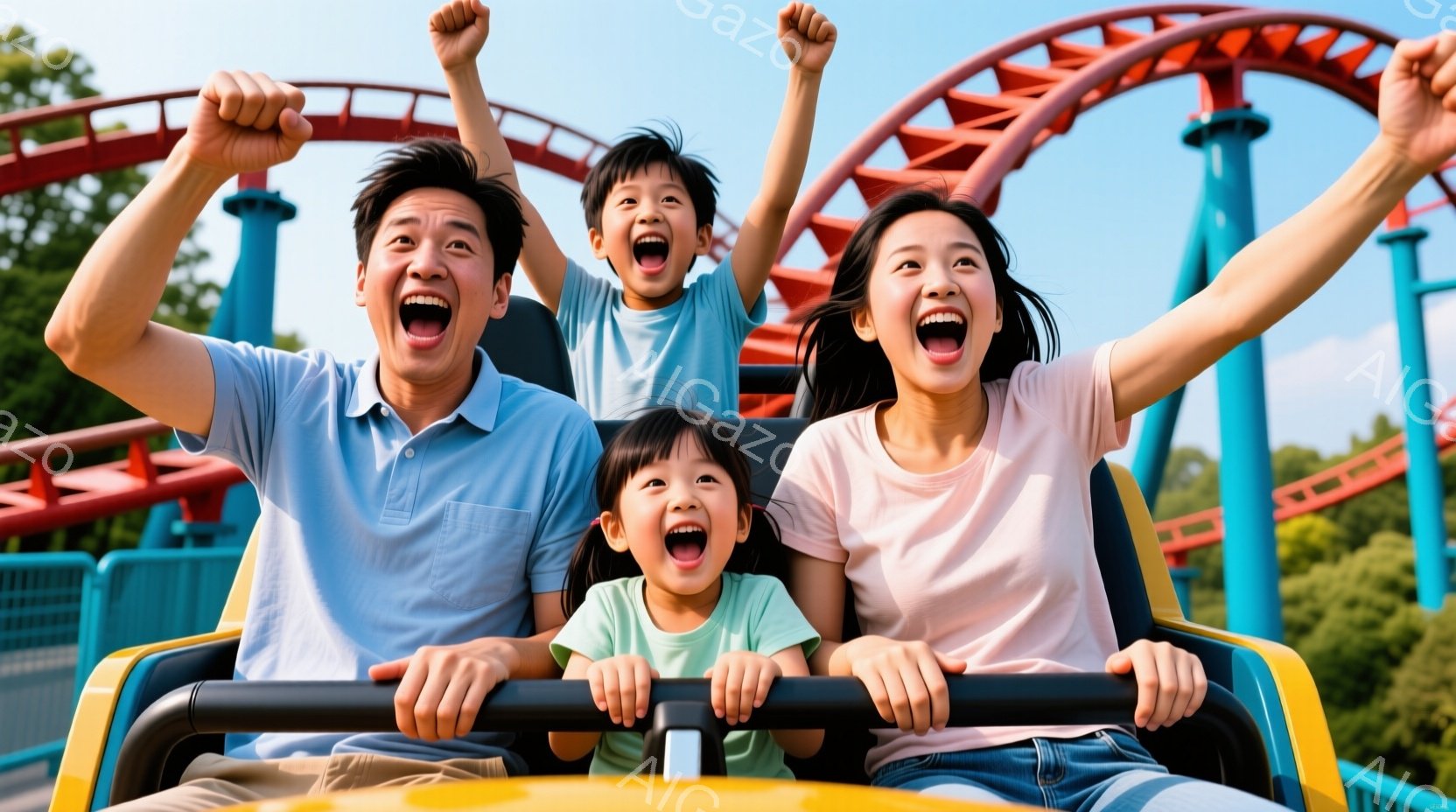 笑顔の家族がメリーゴーランドに乗っている様子が写っています。母親はベージュ色のカーディガンを着ており、父親は白のシャツにズボン姿です。二人の子供たちはそれぞれ白いシャツと水色のシャツを着て、馬の形をした乗り物にしがみつき、楽しそうに笑っています。