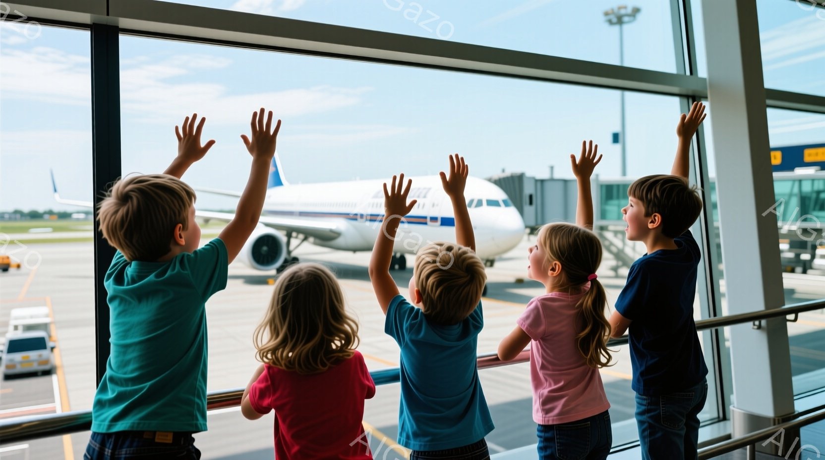 一家三人が空港の待合室を歩いている様子が写っている。母親はピンクのシャツとジーンズ姿で、父親は青いシャツとジーンズを着用し、子供は濃い色の上下と白いスニーカーを履いている。彼らは全員手荷物を引きずり、家族の手を繋いでいるため、温かく幸せな雰囲気が漂っている。