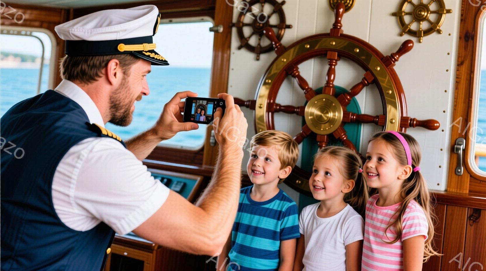 家族が旅行中、船の客室内で歯磨きをする場面を写したものです。全体として、親子間の楽しさや家族の時間を共有する様子が伝わっています。 - 大人は笑顔で、子供たちもポジティブな表情を見せています。 - 男性は上手に歯磨きをしているのに対し、女性と子供たちは初心者らしい姿勢で歯磨きを行っています。