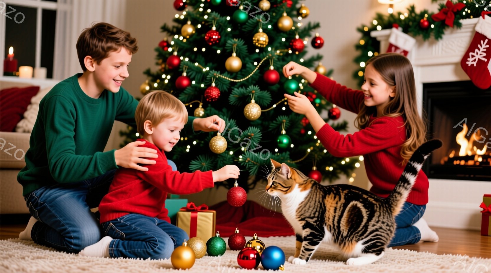茶色の縞模様の猫が床の上で赤いレーザーポインターを追いかけています。ソファーに座っている母親は長い茶色の髪で、息子の笑顔を見ながら楽しんでいます。背景には、暖色系の照明と植物が置かれた落ち着いたリビングルームがあり、家族の温かい雰囲気が伝わってきます。