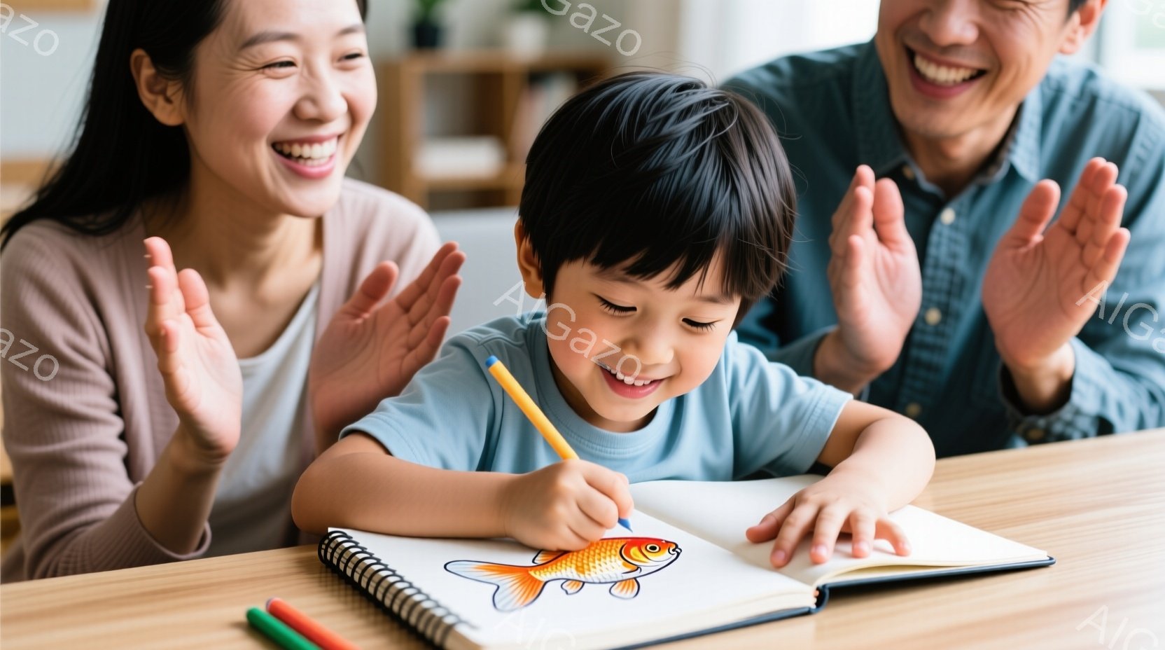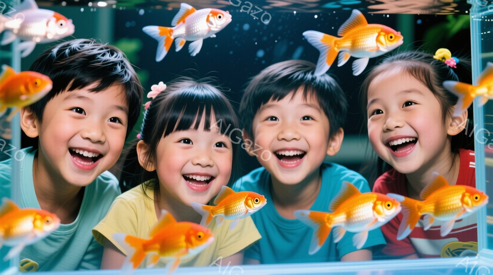 金髪の少年と少女が屋外のテーブルを囲み、大きな金魚鉢の中にいる金魚を見つめている。父親は子供たちに寄り添い、風鈴を手に持っている。背景にはレンガの建物と緑豊かな植物が見え、晴れた日の穏やかな雰囲気が漂っている。