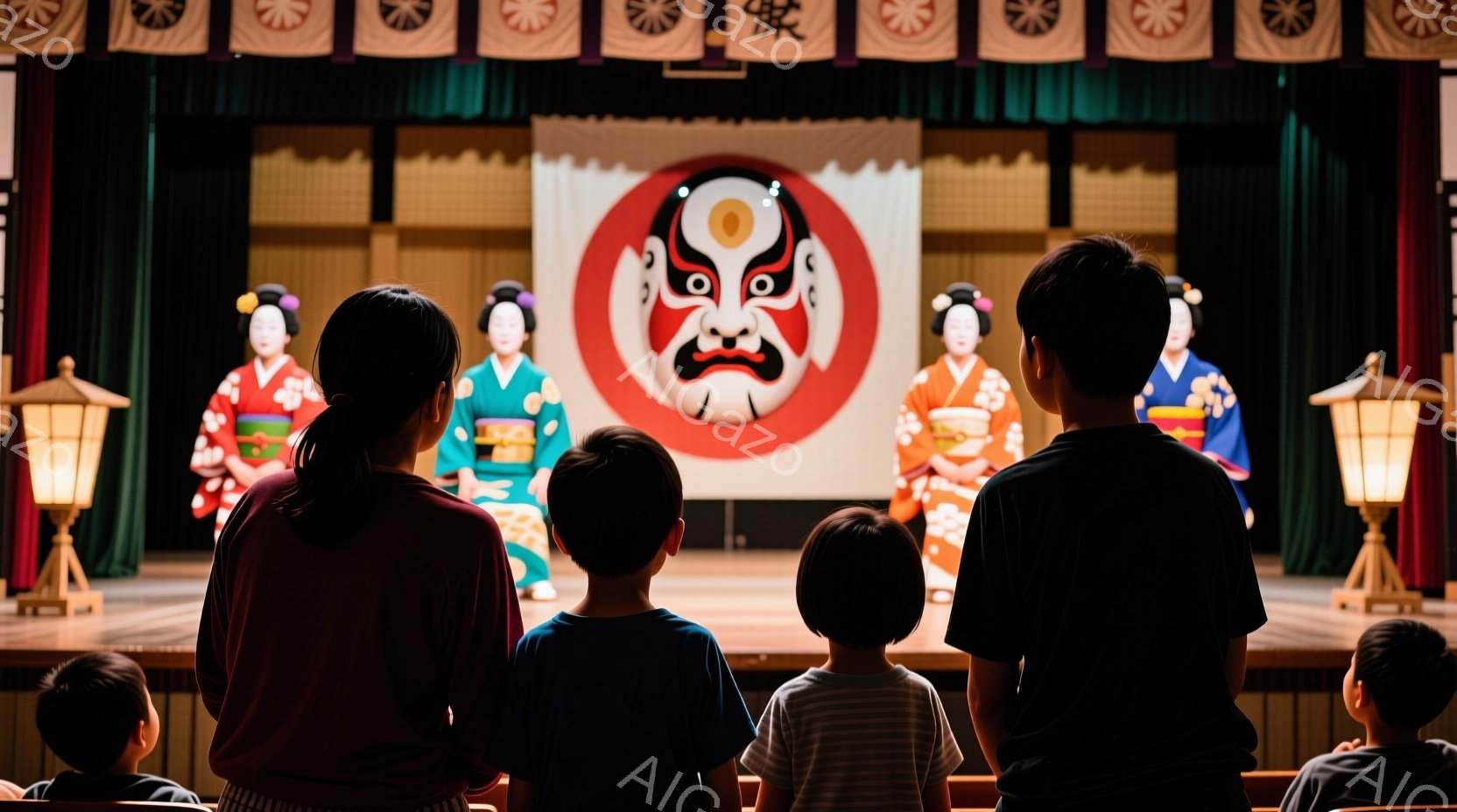 この無料AI生成画像「舞台の袖で、着物を着た女性と幼い子供たちが、隈取(くまどり)のメイクをした歌舞伎役者と対面している様子が描かれています。女性は薄緑色の着物で、子供たちはそれぞれ水色とピンクの可愛らしい着物を着ており、皆笑顔で役者を見つめています。背景には、赤い緞帳(どんちょう)と、他の着物姿の人物、そして観客席が見え、温かい家族の雰囲気が漂っています。」は、2025年10月26日に作成されました。 サイズは 1664×928px の高解像度で、商用利用も可能なフリー素材として提供しています。