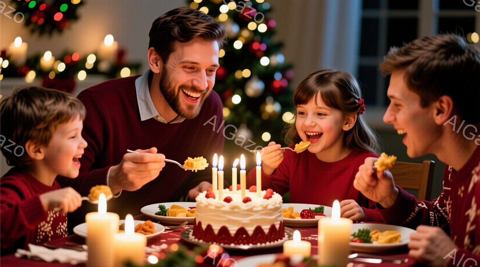 家族四人が食卓を囲んで食事をしている様子が写っている。母親と父親は笑顔で、それぞれ子供たちと向かい合って箸で料理を取っている。背景には赤い提灯のようなものが飾られ、温かく幸せな家庭の雰囲気が漂っている。