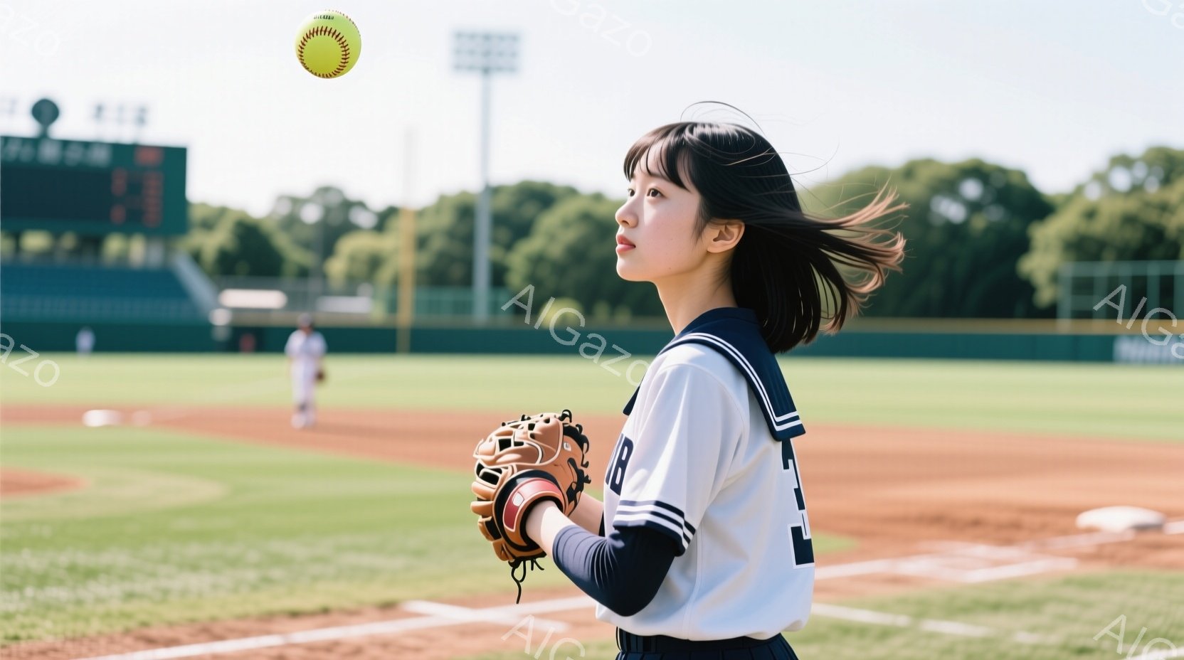 野球の試合が行われている球場の一場面です。制服を着た女子高生が、野球のボールをキャッチしようと、少し上を見上げています。背景には緑豊かな芝生、ネット、そして遠くには他の選手や建物が見え、晴天の日の活気ある雰囲気が伝わってきます。