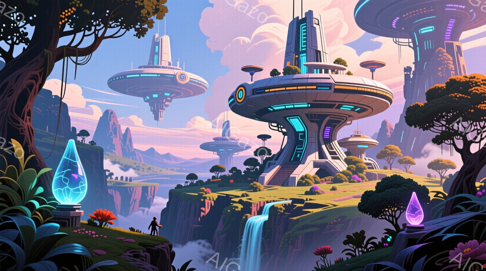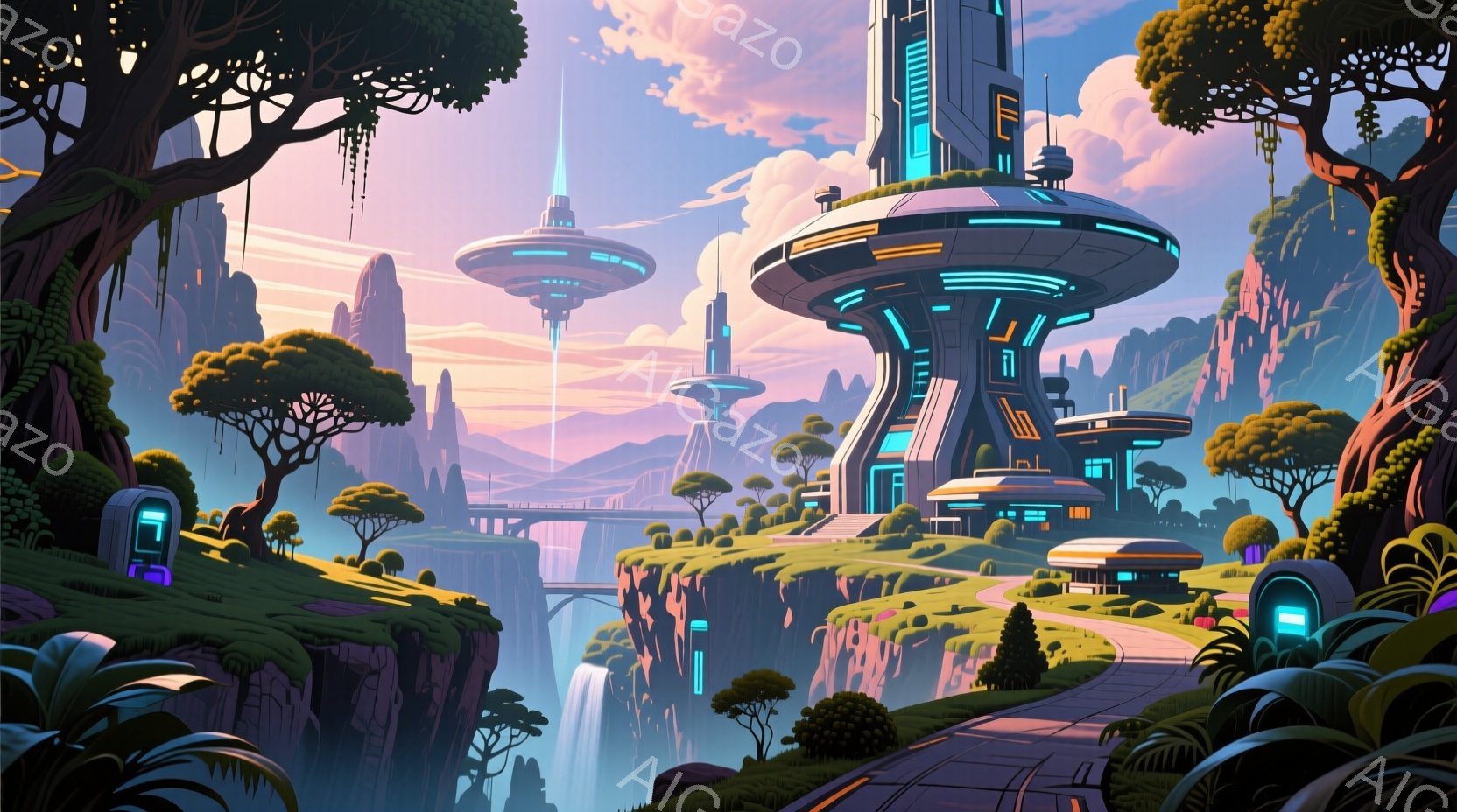 巨大な滝が流れ落ちる緑豊かな崖の上に、未来的な建造物がそびえ立っています。周囲には独特の赤い花を咲かせた樹木が生い茂り、遠くには山々と、空中に浮かぶ円盤状の構造物が見えます。全体的に幻想的で神秘的な雰囲気を漂わせ、異世界への入り口のような景観です。