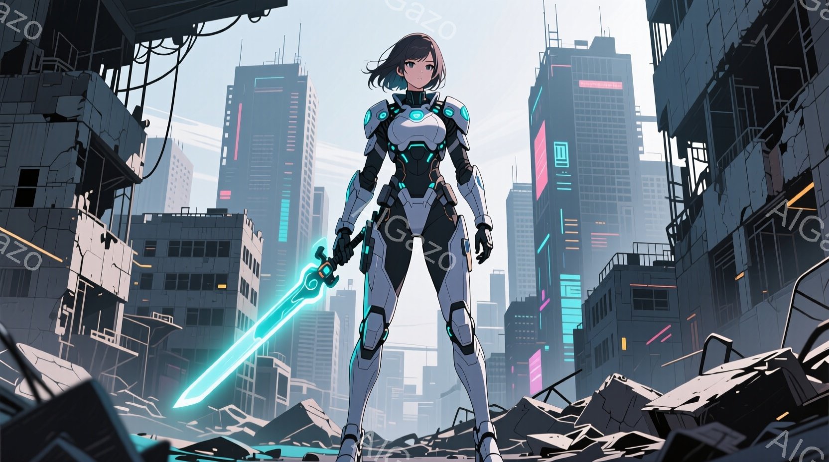 灰色の廃墟と高層ビルが立ち並ぶ背景に、未来的な装甲服を着た女性が立っている。彼女は短い黒髪で、青色の光る剣を構え、決意に満ちた表情で正面を見据えている。破壊された都市の残骸と、空にはわずかな雲が見られ、全体的に荒廃と希望が入り混じった雰囲気である。