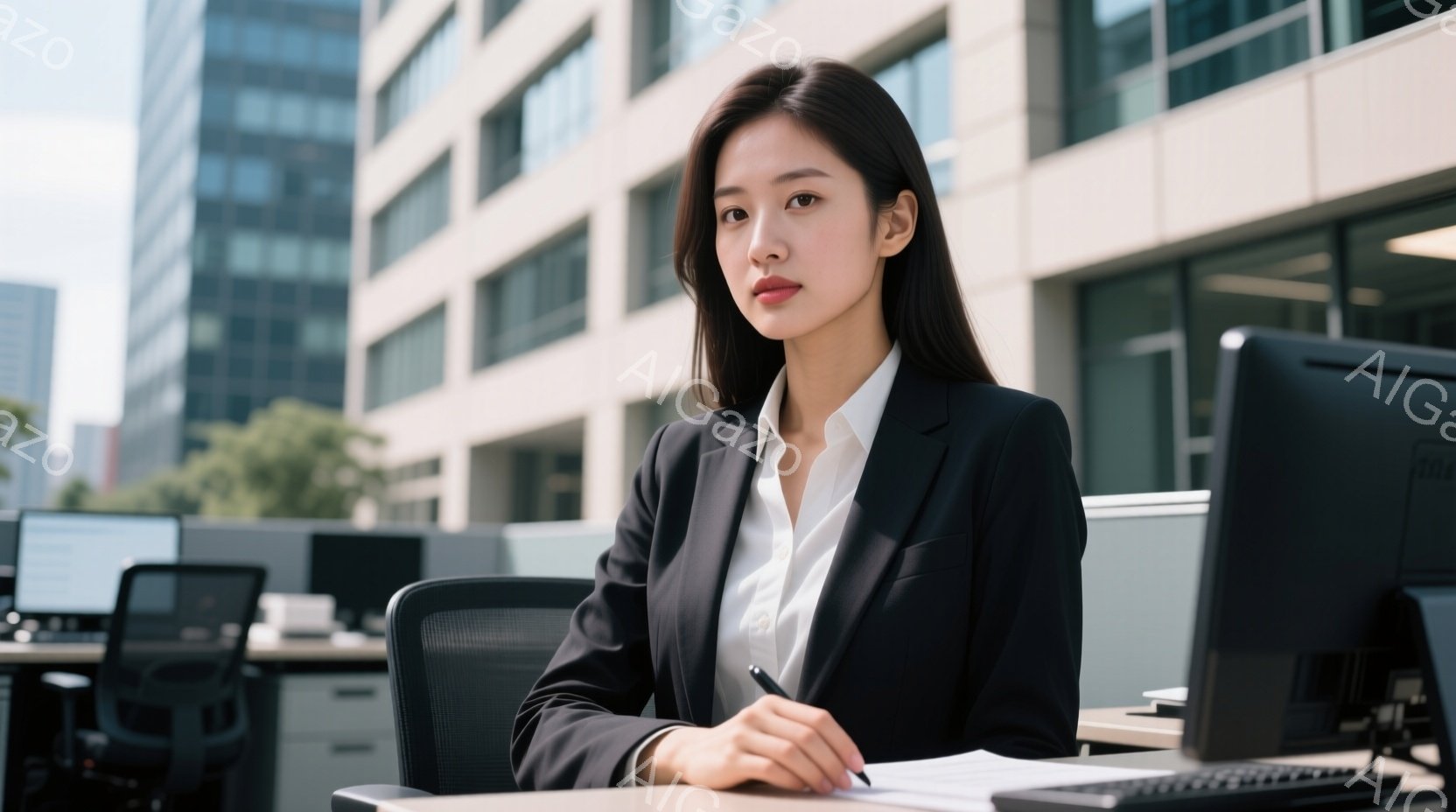 オフィスで働く女性が描かれています。彼女は白のブラウスに黒いジャケットとパンツスーツを着ており、髪は後ろでまとめています。集中した表情でキーボードを操作しており、周囲には他のデスクやオフィス機器が見えます。