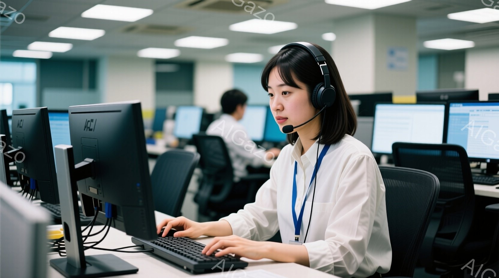 白いシャツを着た若い女性が、オフィスでコンピューターに向かってキーボードを打っています。彼女は短い黒髪で、やや真剣な表情をしています。背景には他のコンピューターとオフィスチェアが見え、全体的に落ち着いた雰囲気です。