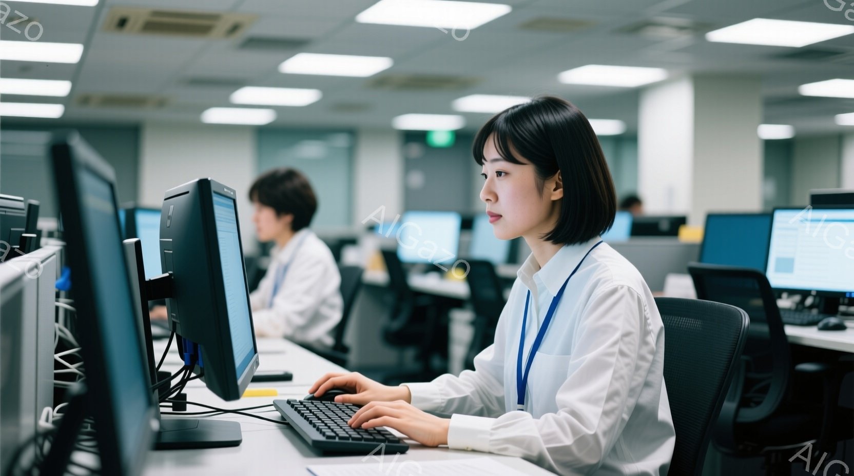 白いシャツを着た若い女性が、オフィスでコンピューターに向かってキーボードを操作している。彼女は髪を後ろで一つにまとめ、真剣な表情で画面を見つめている。背景には、他のオフィスワーカーや整然と並んだ机が見え、全体的に集中した仕事環境を伝えている。