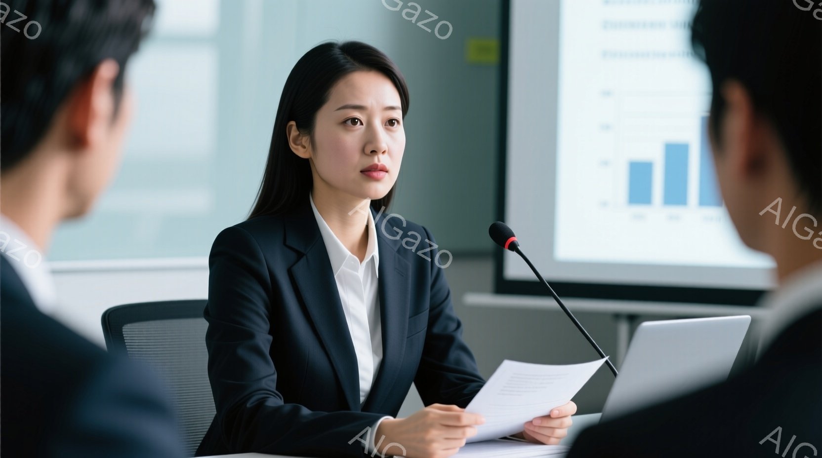 会議室で、スーツ姿のビジネスパーソンたちが書類を手にしている様子が写っている。女性は笑顔で書類を同僚に手渡し、他のメンバーはそれを真剣な眼差しで見つめている。背景には大きな窓があり、オフィスビルが見え、明るく清潔な印象を与える。