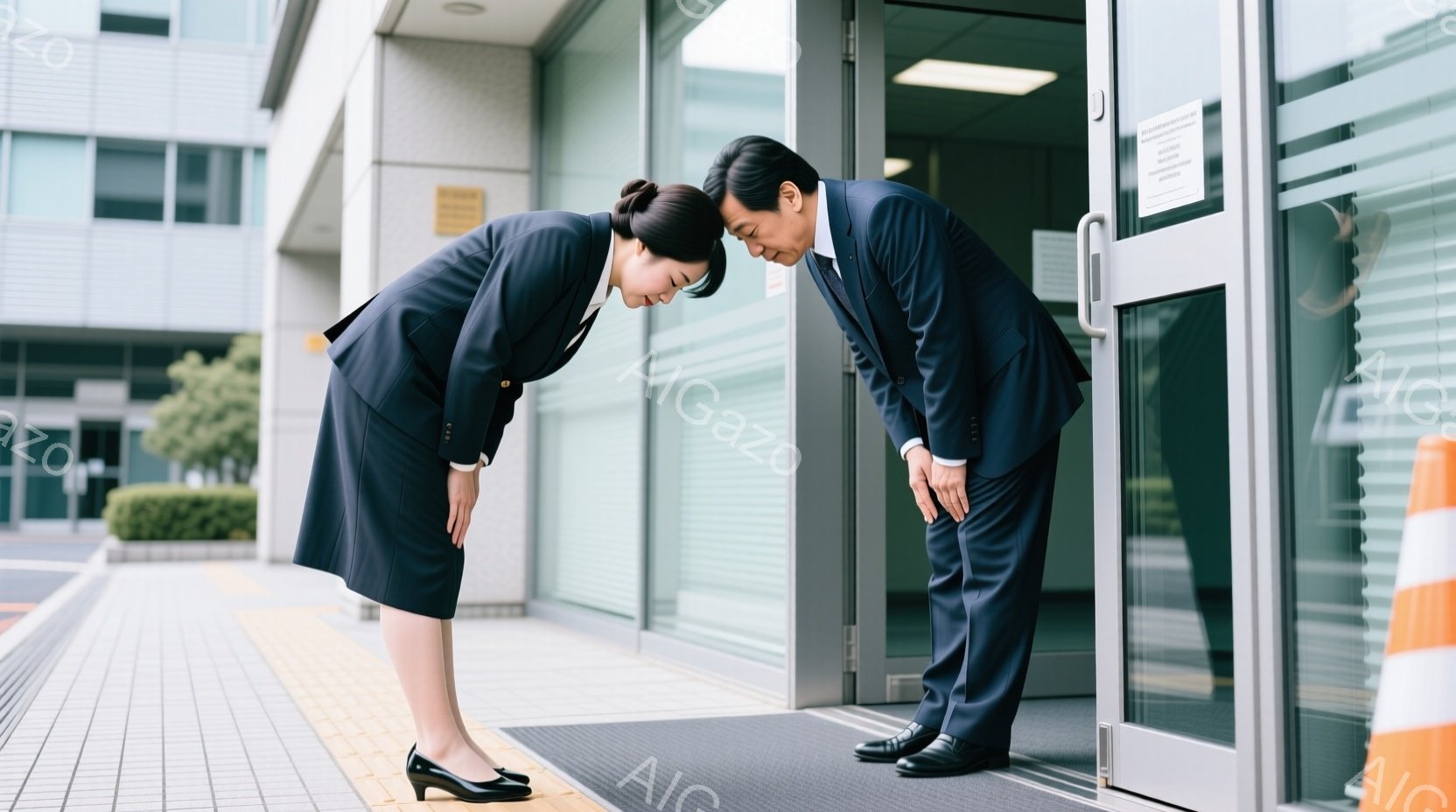 この無料AI生成画像「スーツを着た男女が、玄関の前で深くお辞儀をしています。女性は黒いワンピース型のスーツにハイヒールを履き、男性は黒いスーツを着ています。背景にはガラス張りのドアとオフィスのような室内、そして植物が見え、全体的にビジネスシーンの礼儀正しさを感じさせる雰囲気です。」は、2025年10月26日に作成されました。 サイズは 1664×928px の高解像度で、商用利用も可能なフリー素材として提供しています。