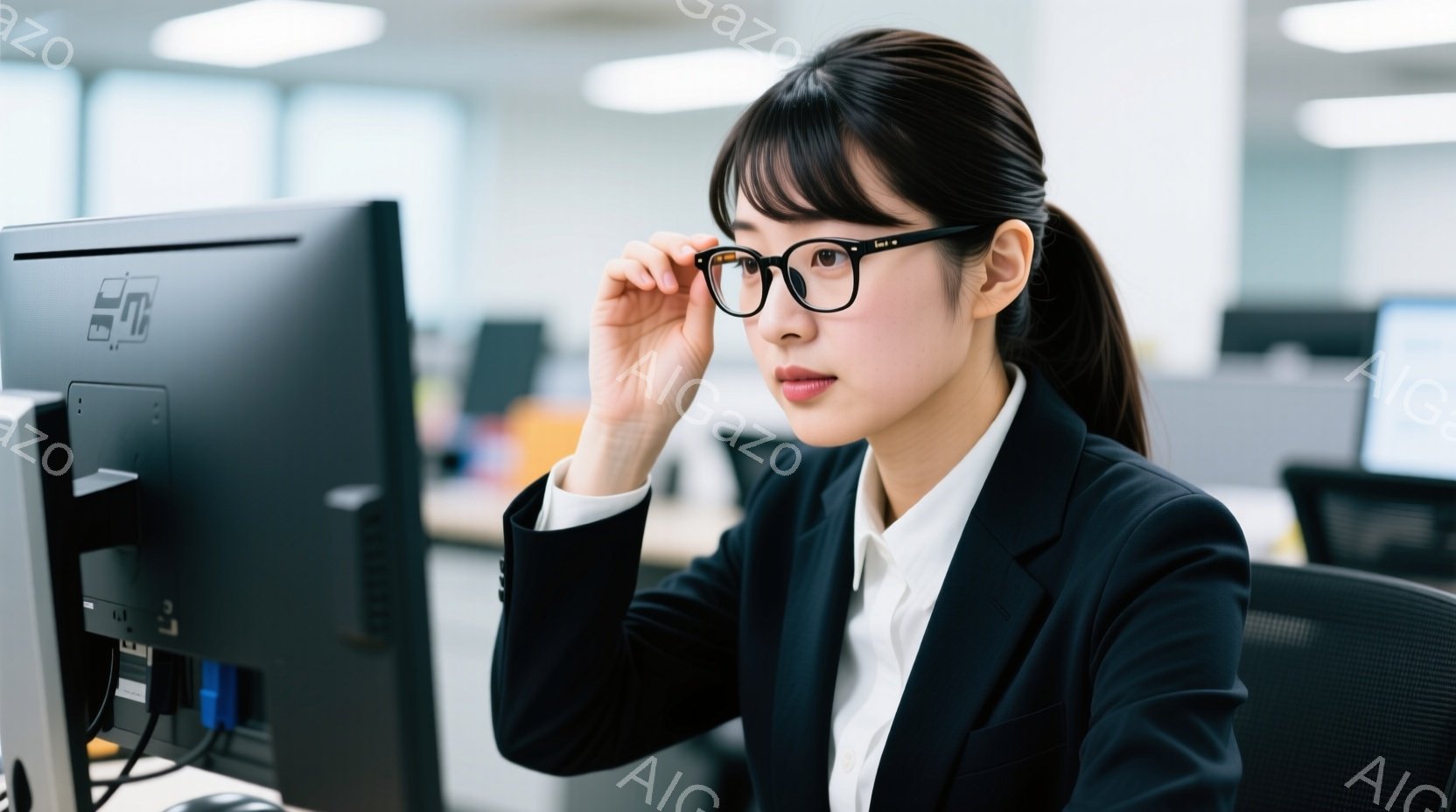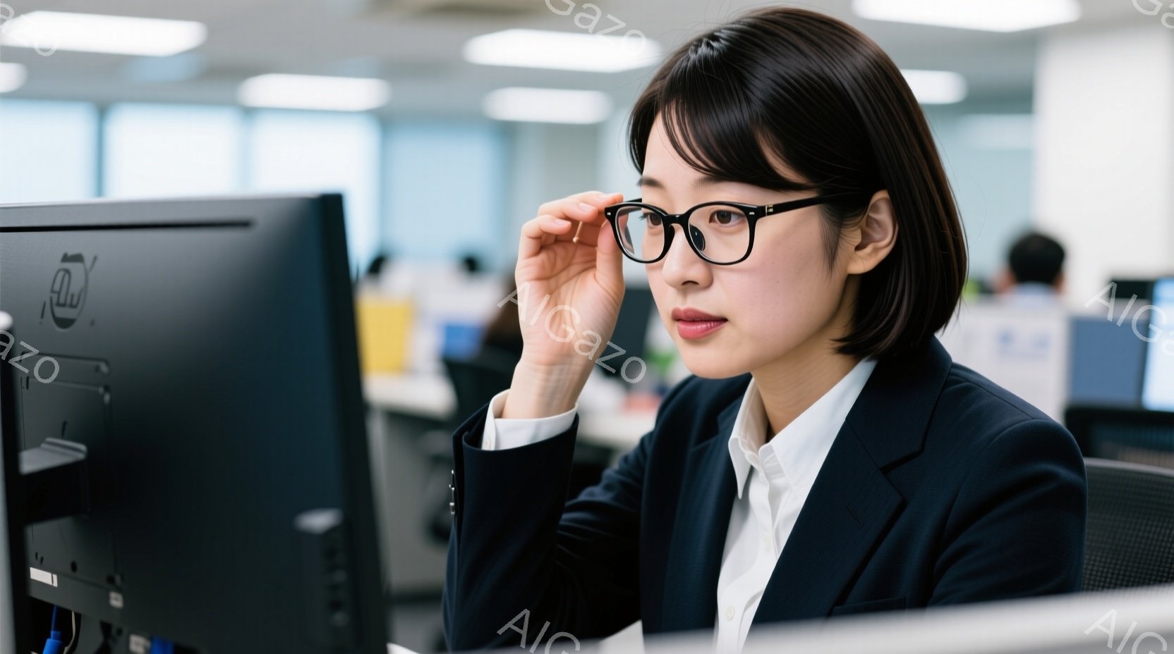 黒いスーツと白いシャツを着た若い女性が写っています。彼女はメガネをかけ、コンピューター画面を見つめながら、やや真剣な表情をしています。背景にはオフィスらしき空間が広がり、他のデスクやオフィス機器が見えます。