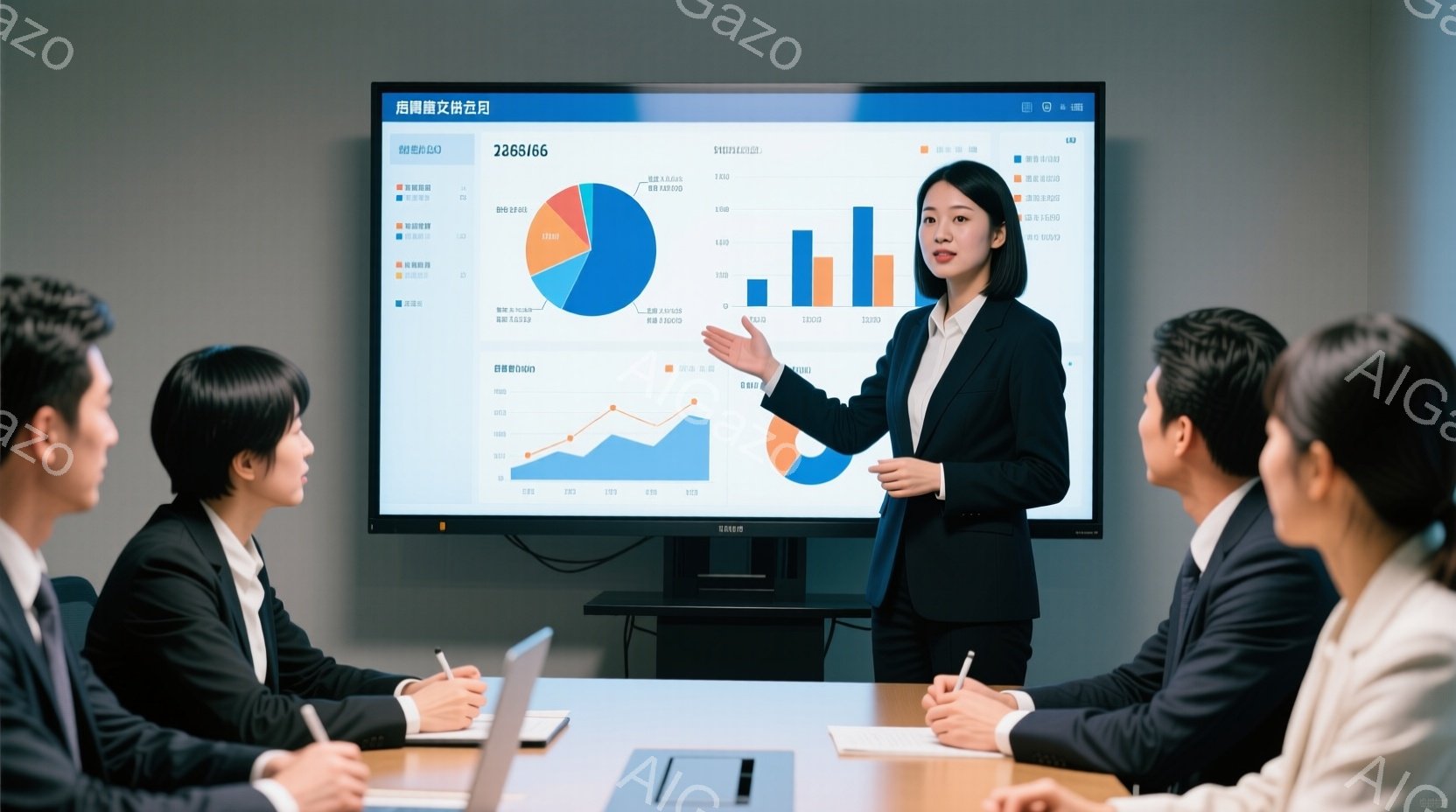 ビジネスシーンの画像で、女性がプレゼンテーションを行っています。彼女は黒いスーツを着用し、髪は後ろでまとめており、真剣な表情で画面を指し示しています。参加者は皆スーツ姿で、テーブルを囲んで彼女のプレゼンテーションに注目しており、背景には大きなモニターとシンプルな内装の会議室が見えます。