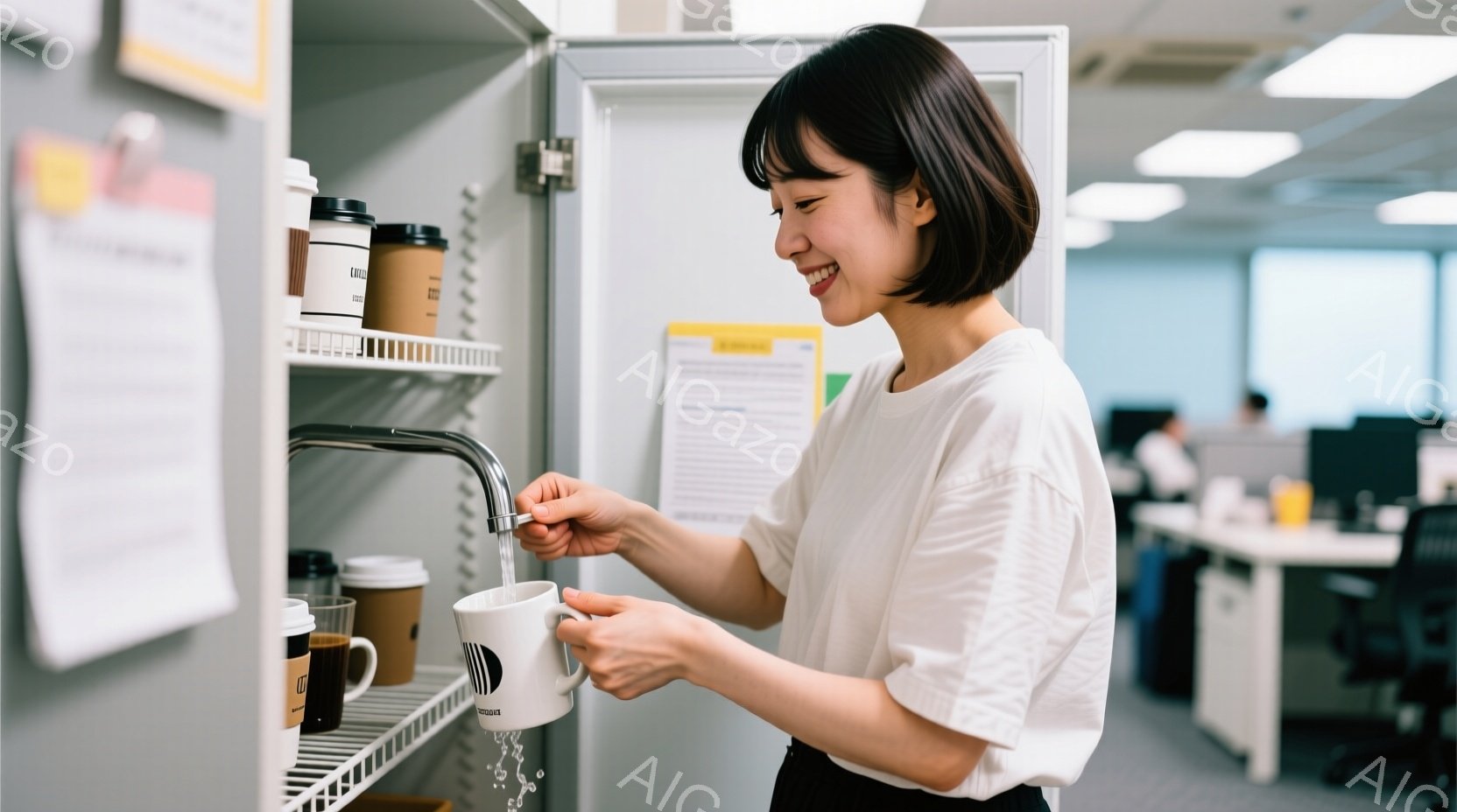 女性は白いオーバーオールの上にクリーム色の長袖シャツを着ており、短くダークブラウンのヘアスタイルで微笑んでいます。彼女はオフィス内の小さなシンクで白いマグカップを洗い、片手を水栓に、もう片手でカップを持っています。背景にはオフィス内の他のデスクや収納棚が見え、全体的に明るく清潔な雰囲気です。