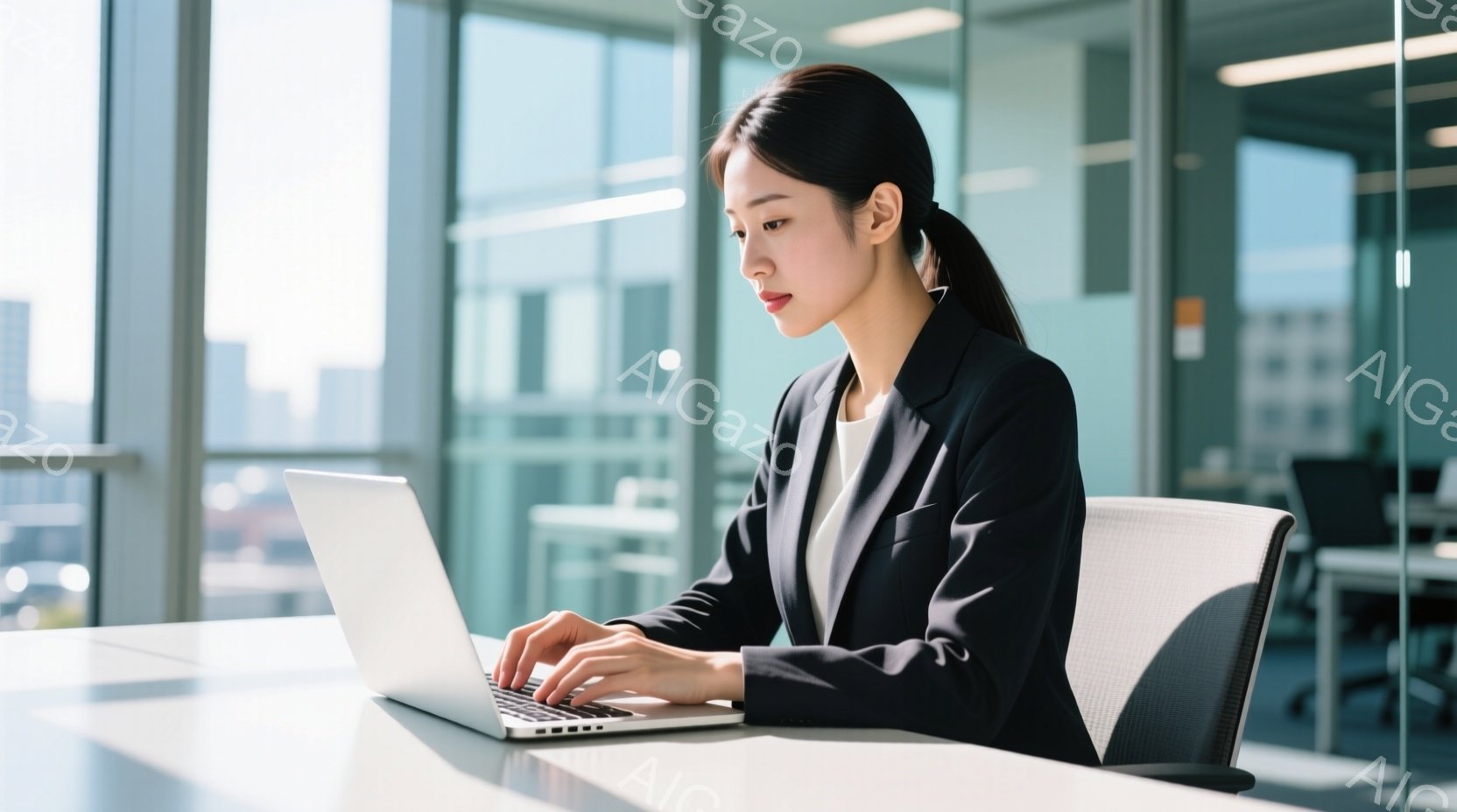 彼女は白いブラウスに黒いジャケットを着て、真剣な表情でノートパソコンのキーボードを操作している。姿勢はまっすぐで、集中している様子が伝わる。背景にはオフィスらしき空間が広がり、大きな窓からは明るい光が差し込んでいる。