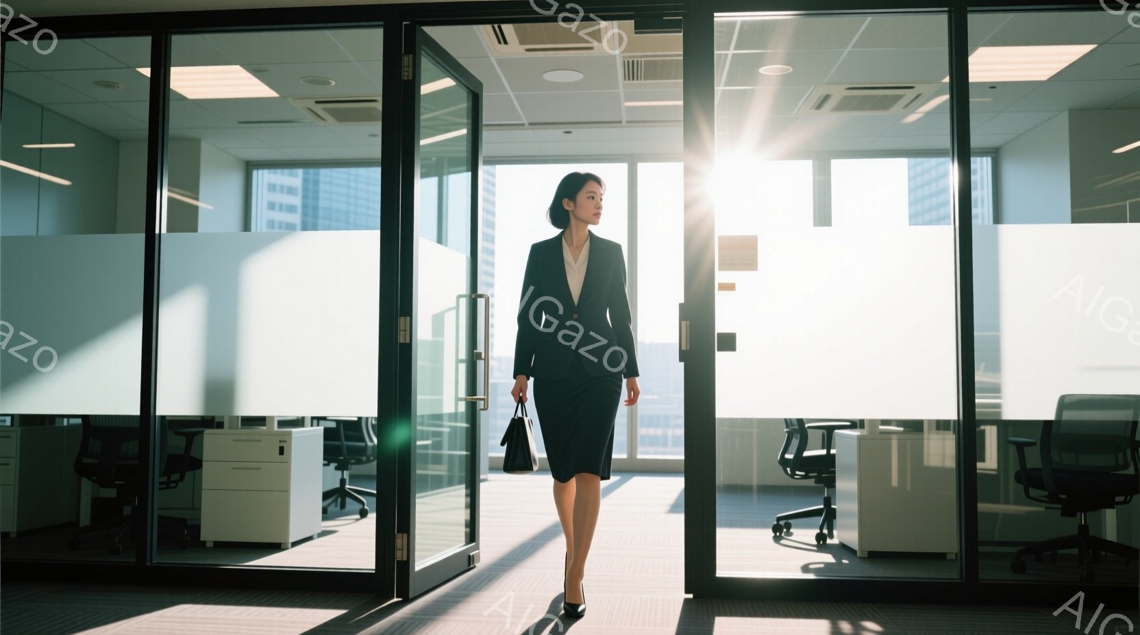 黒いスーツと膝丈のスカートを着用した女性が、ガラス張りのドアからオフィスに入ろうとしている姿が描かれている。彼女は黒いハンドバッグを持ち、ヒールを履いており、自信に満ちた表情で前を見据えている。背景にはオフィススペースが広がり、光が差し込み、モダンでプロフェッショナルな雰囲気を醸し出している。