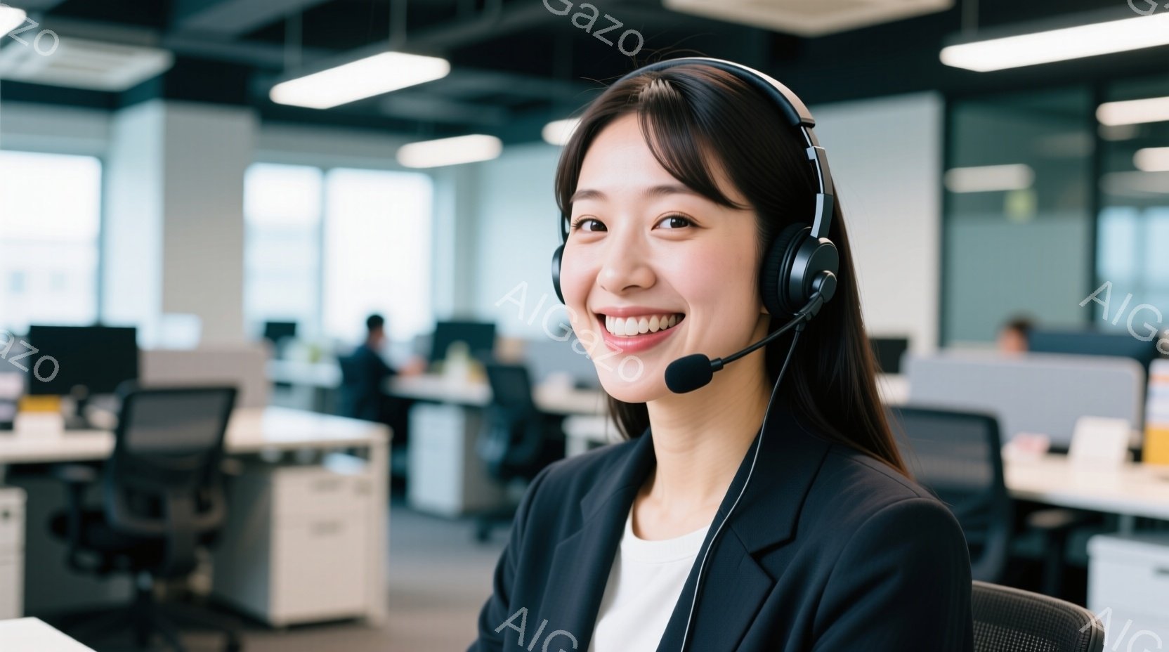 明るい笑顔を浮かべた若い女性が、ヘッドセットを着用してカメラに向かって微笑んでいます。彼女は白いシャツの上に黒いベストを着ており、ロングヘアは肩にかかるように流されています。背景はオフィスで、他の従業員やデスク、そして窓から差し込む光が見え、活気がありながらも清潔な雰囲気が漂っています。