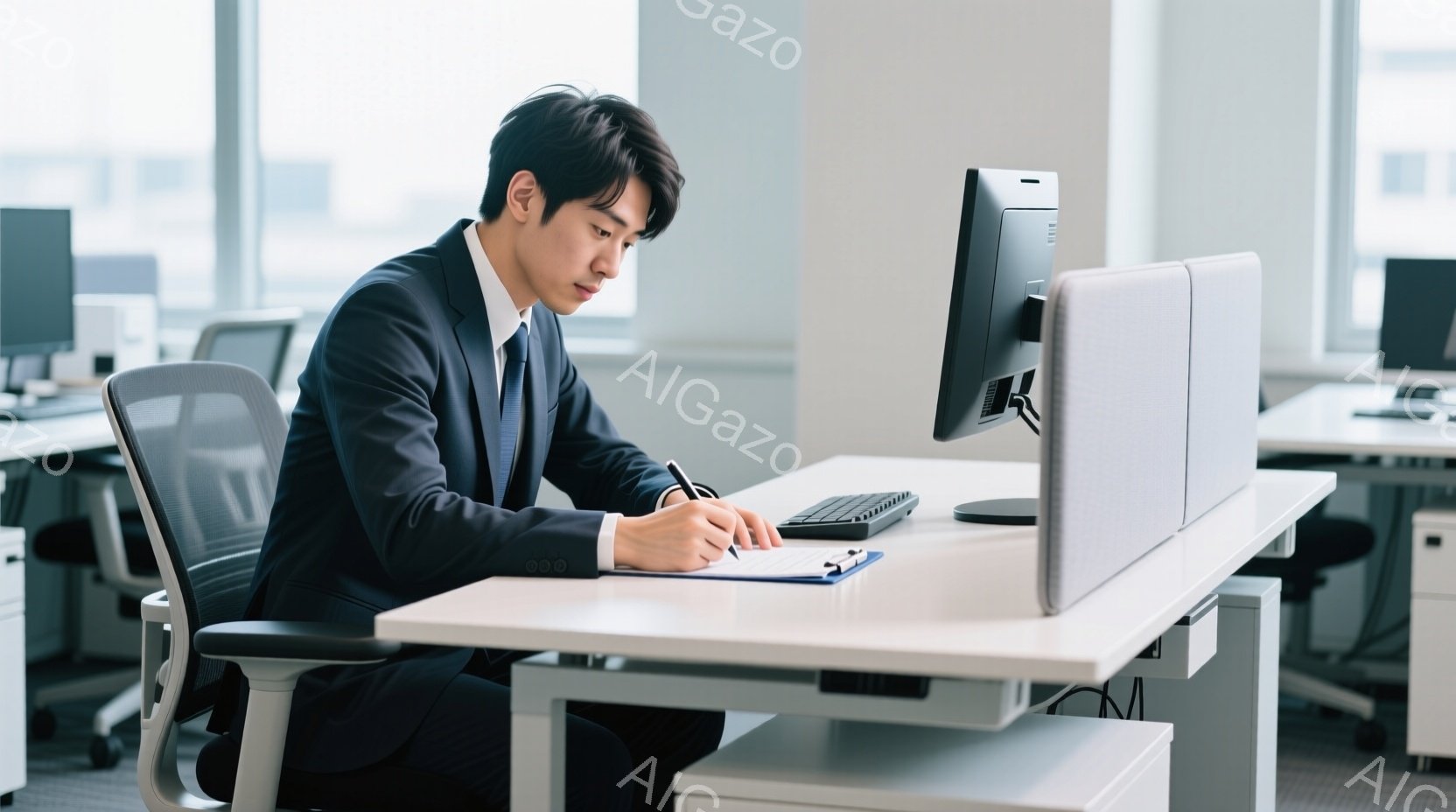 スーツを着た若い男性がオフィスで書類にペンで記入している。彼は椅子に座って前かがみになり、真剣な表情で作業に集中している。背景には、他のオフィスワーカーと整然と配置されたデスクが見え、全体的に落ち着いたプロフェッショナルな雰囲気が漂っている。