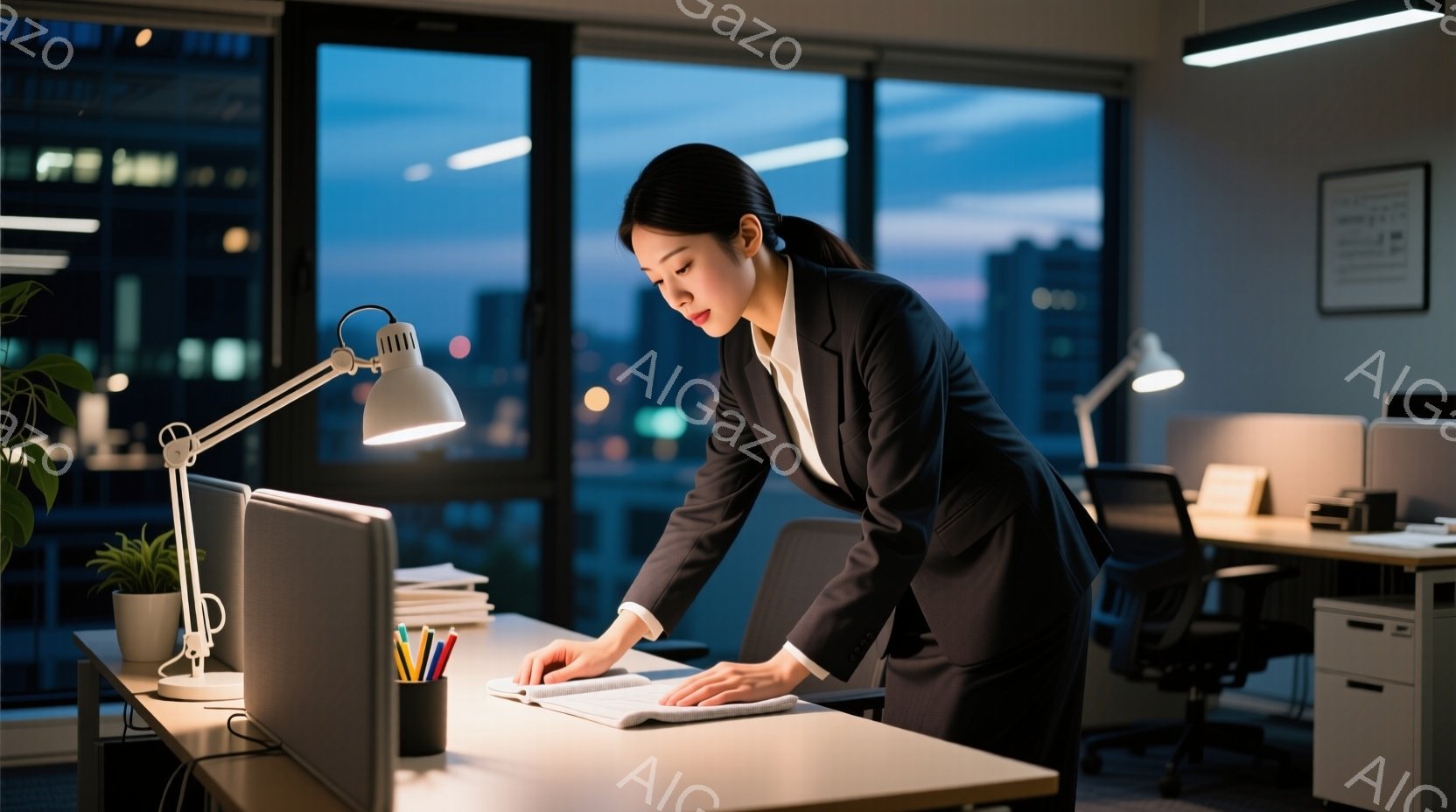 仕事着の女性が、オフィスでデスクに置かれた書類を拭いています。彼女は黒いスーツを着ており、髪は後ろでまとめています。背景には夜景が広がり、ビルの明かりがちらちらと見えます。