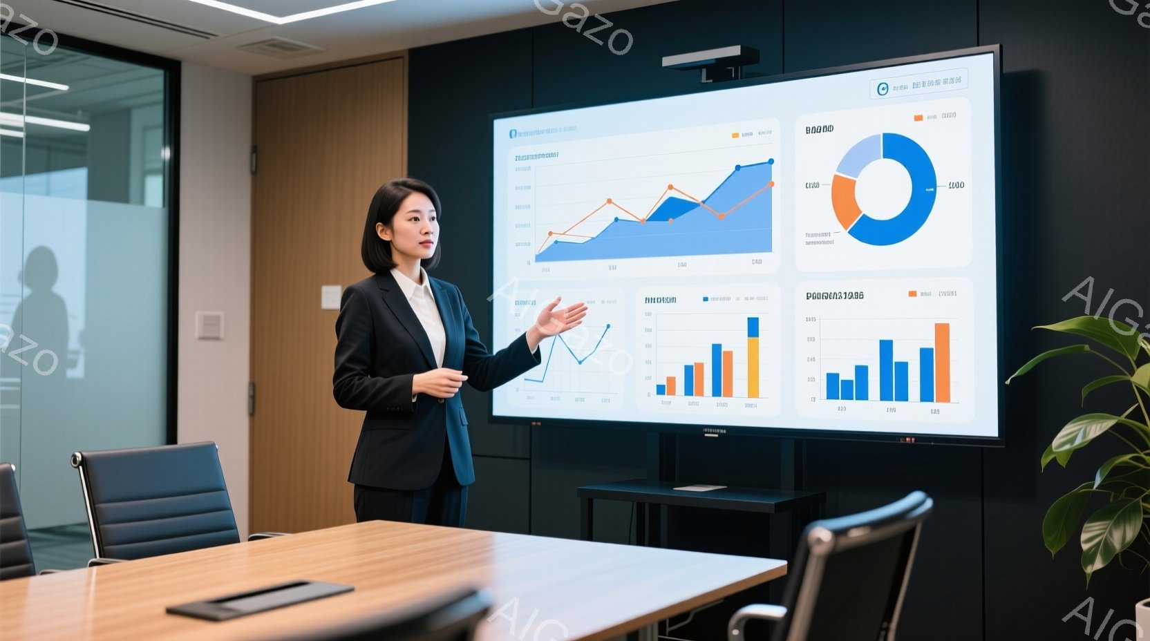 室内では、女性がプレゼンテーションを行っています。彼女は黒いスーツを着ており、髪は後ろでまとめています。背景にはグラフが表示された大きなスクリーンがあり、会議室のテーブルと椅子が配置されています。
