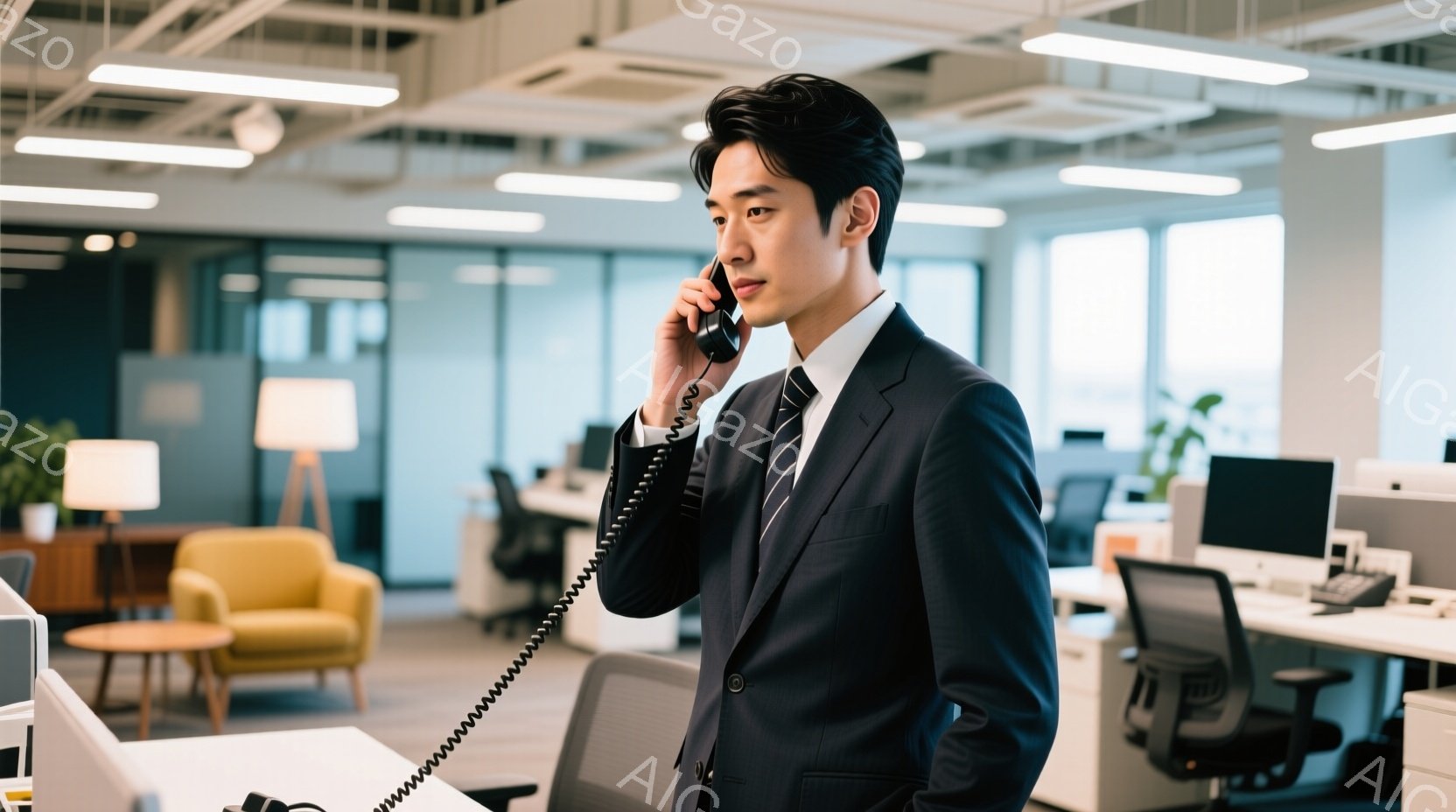 紺色のスーツに白いシャツを着た男性が電話を受けている。彼は笑顔で、少し体を傾けて会話を楽しんでいる様子が伺える。背景はオフィスで、明るく開放的な空間が広がっており、他のデスクや椅子、そして柔らかい光が差し込む窓が見える。