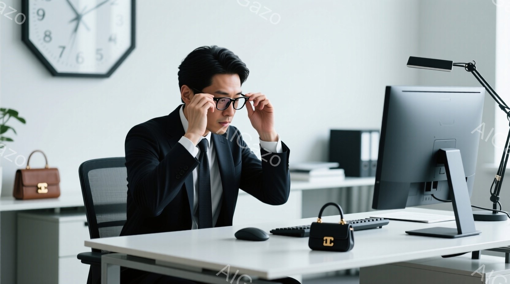 スーツにネクタイを締めた男性が、オフィスでコンピューターに向かっています。彼は集中した表情でキーボードを操作しており、姿勢はきちんとしています。背景には他のデスクやオフィス機器が見え、全体的に落ち着いた雰囲気の職場風景です。