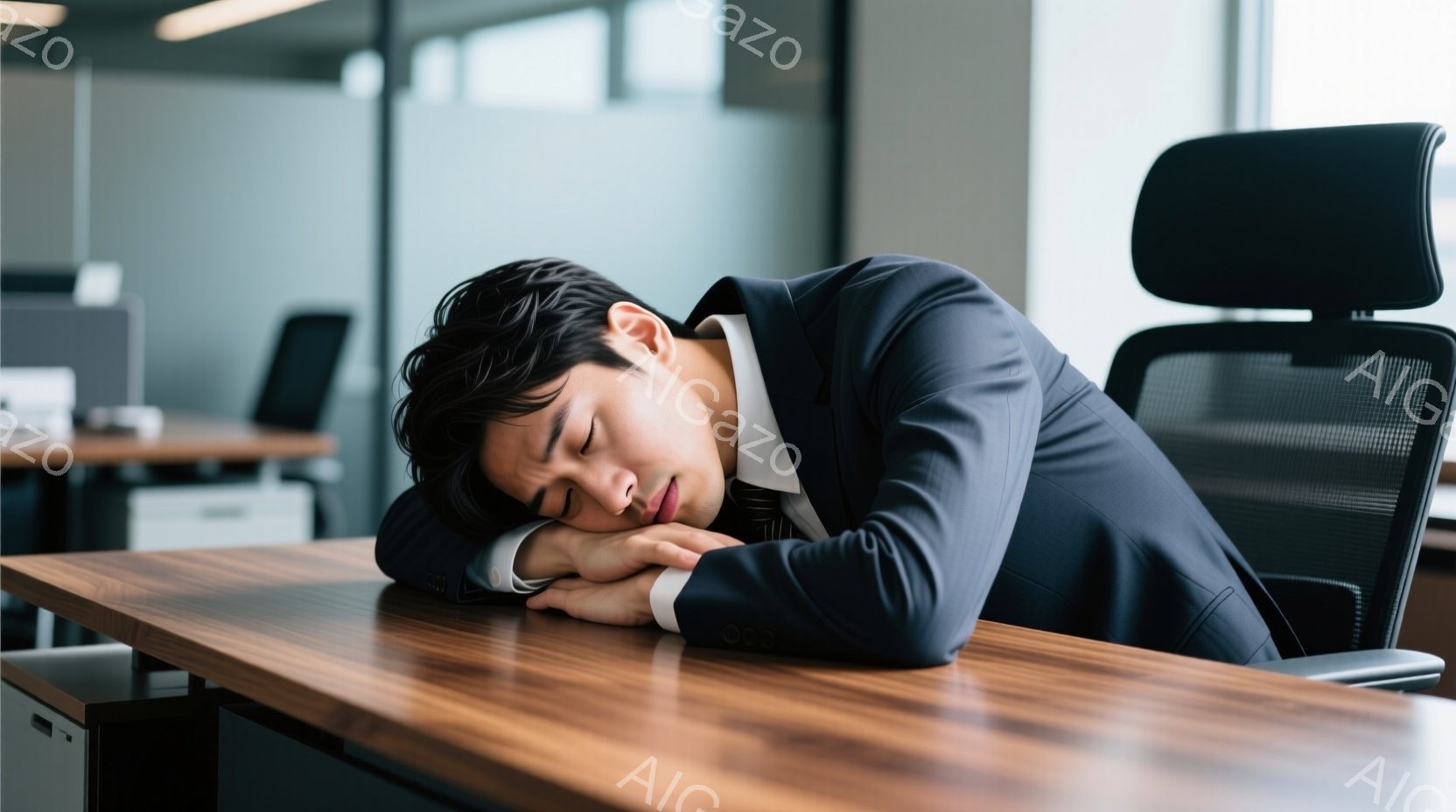 スーツを着た若い男性が、オフィスらしき場所の机にうつ伏せになって眠っている。彼の髪は短く、黒く、顔は腕で覆われているため表情は見えないが、疲労が感じられる。背景にはオフィスチェアが見え、全体的に静かで、疲れた雰囲気の画像である。